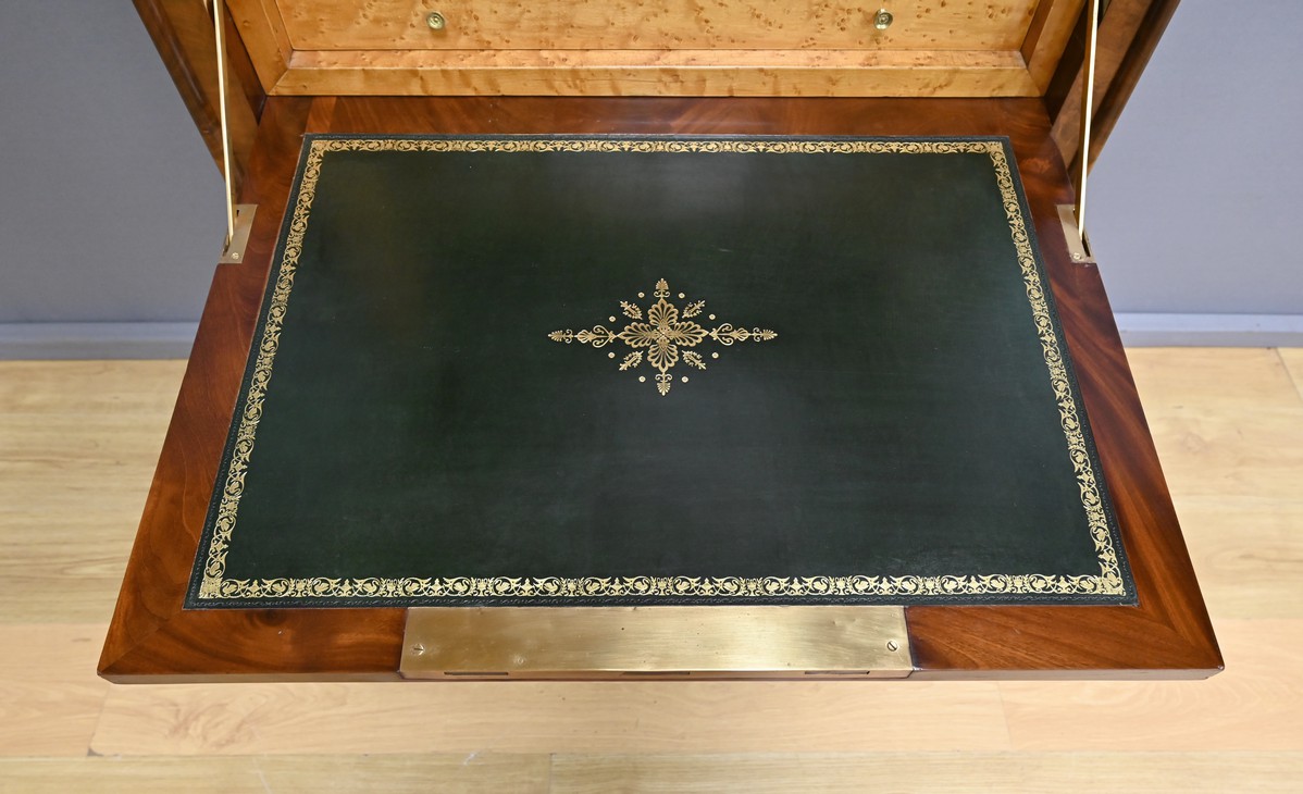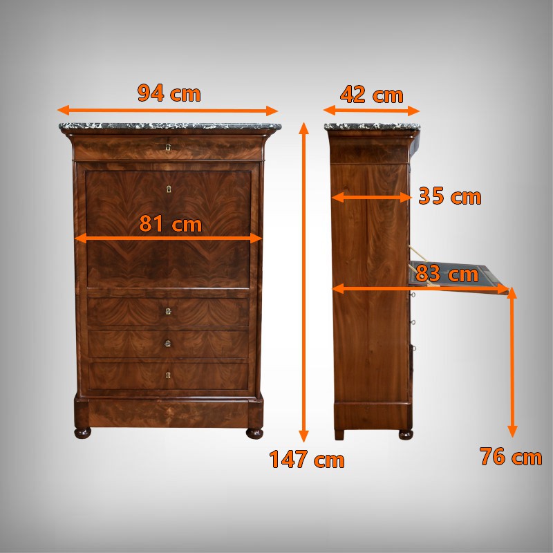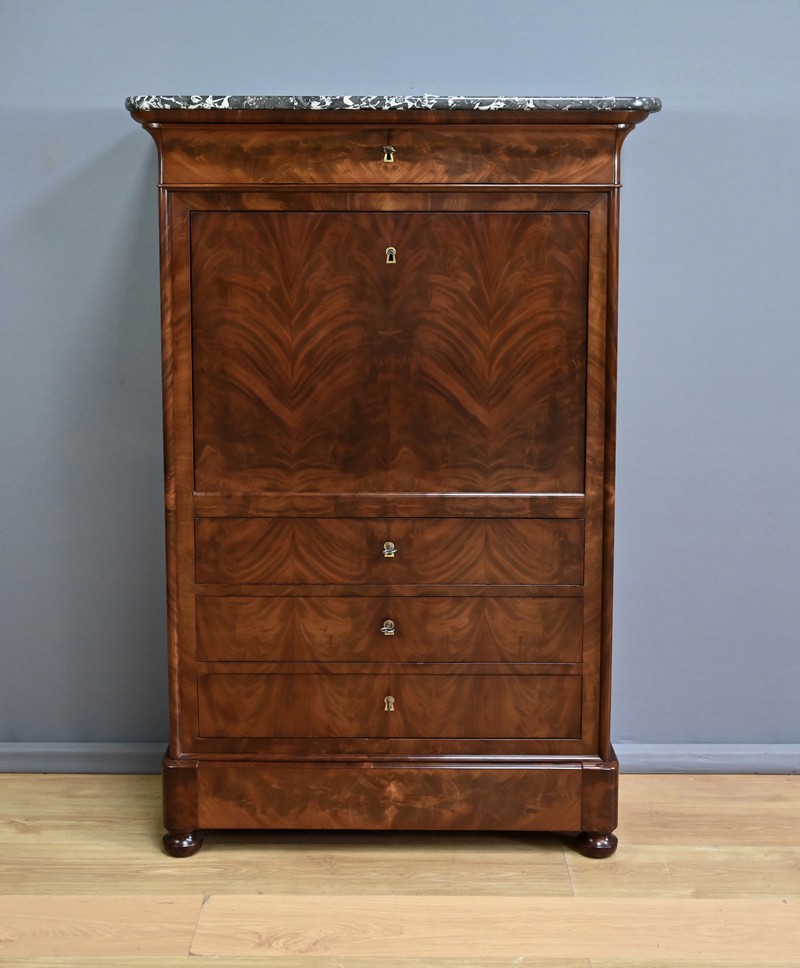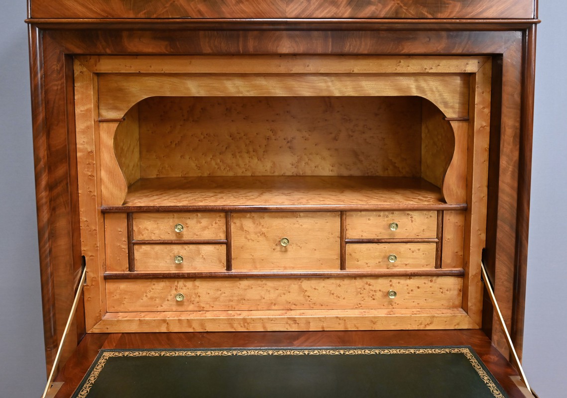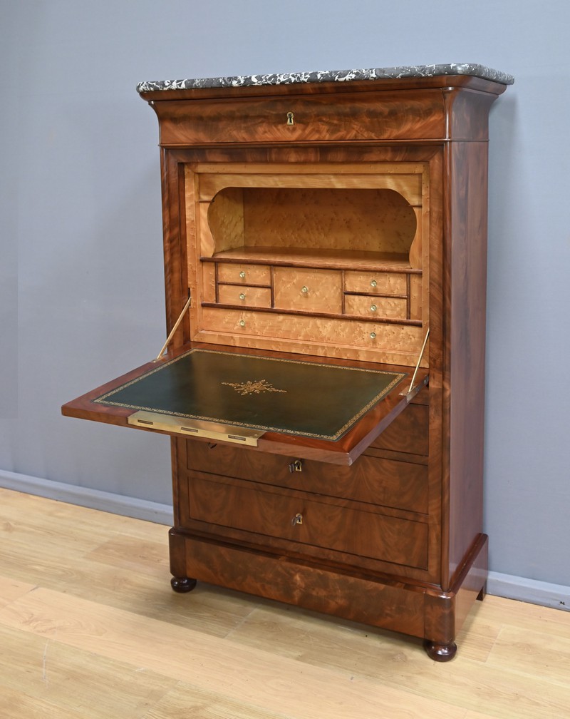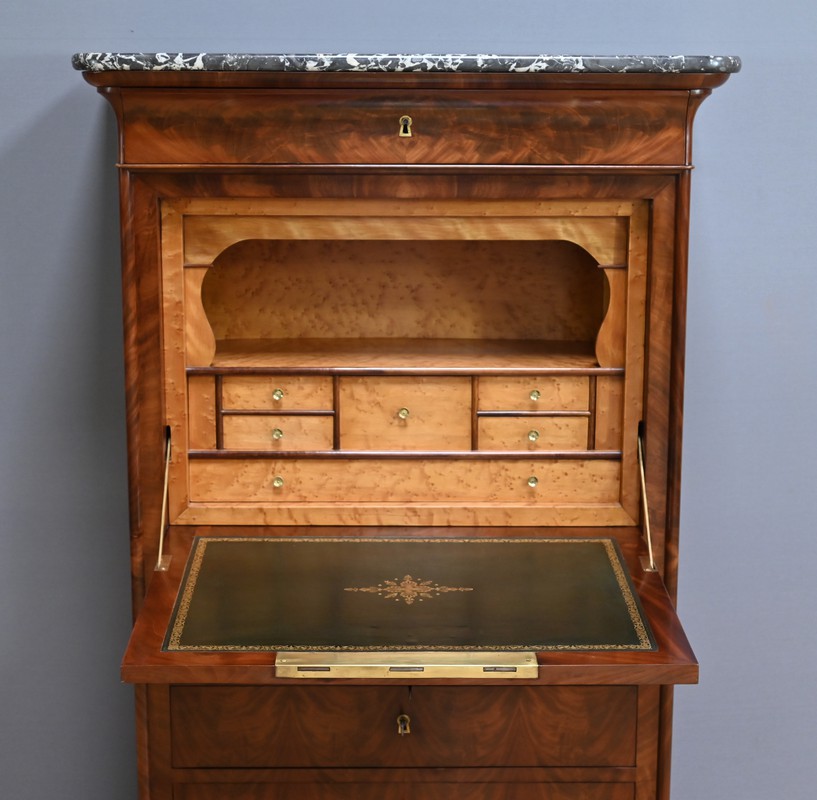 Ce secrétaire d’époque Restauration est une pièce réalisée en placage de ronce d’acajou aux reflets profonds et chaleureux. En partie haute, un tiroir en ceinture s’ouvre à l’aide d’une clé « pique », avec une serrure parfaitement fonctionnelle. L’abattant, plaqué de quatre feuilles de ronce d’acajou disposées à livre ouvert, s’ouvre pour révéler un cuir vert neuf, orné d’une vignette dorée et d’un motif central raffiné. À l’intérieur, un élégant tabernacle en érable moucheté dévoile une grande niche et six tiroirs de tailles variées, tous dotés de boutons en laiton finement ciselés. La partie basse du meuble propose trois grands tiroirs fermant à clé, ainsi qu’un tiroir dissimulé dans la plinthe, pour un rangement discret et ingénieux. Le tout est surmonté d’un marbre gris Saint Anne, sobre et noble, et repose sur des pieds boule écrasés à l’avant, typiques de l’époque. Ce meuble séduit par l’élégance de ses lignes, la richesse de ses matériaux et la subtilité de ses détails. Son cuir vert profond, ses multiples rangements et ses tiroirs secrets en font un meuble aussi pratique que décoratif. Un véritable coup de cœur pour les amateurs de mobilier ancien et de belles finitions.