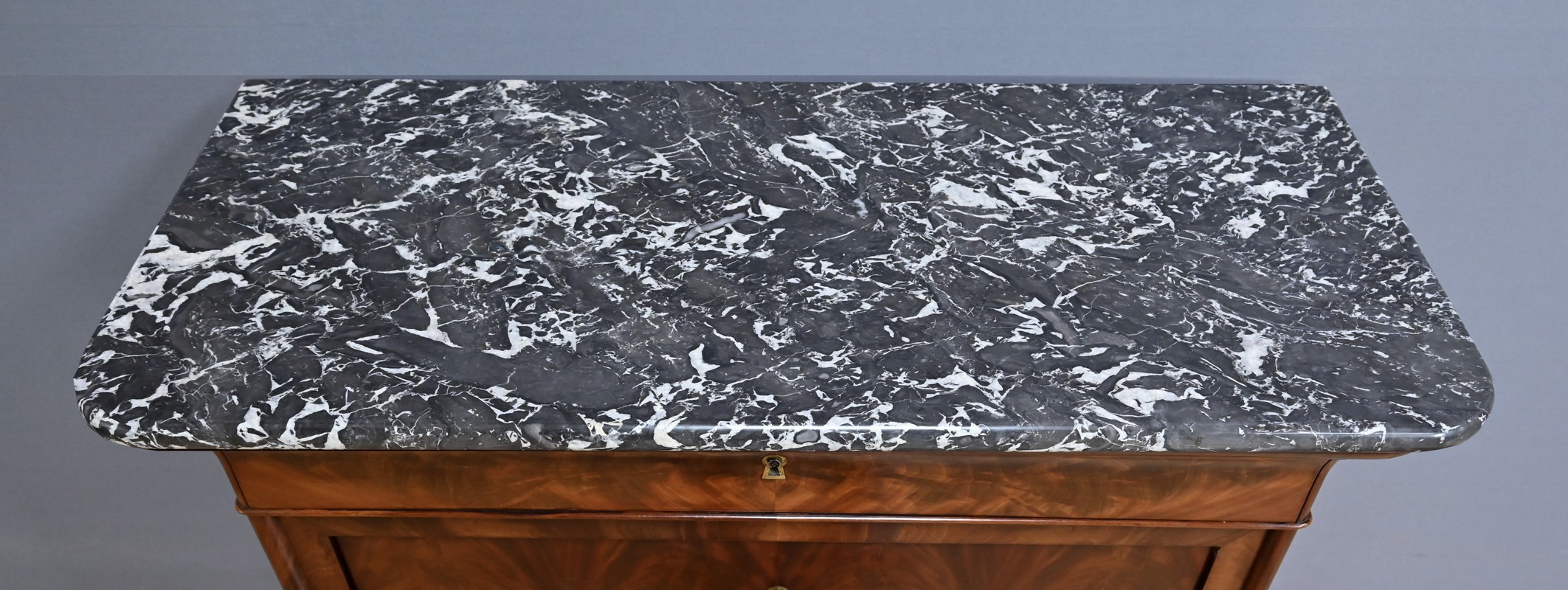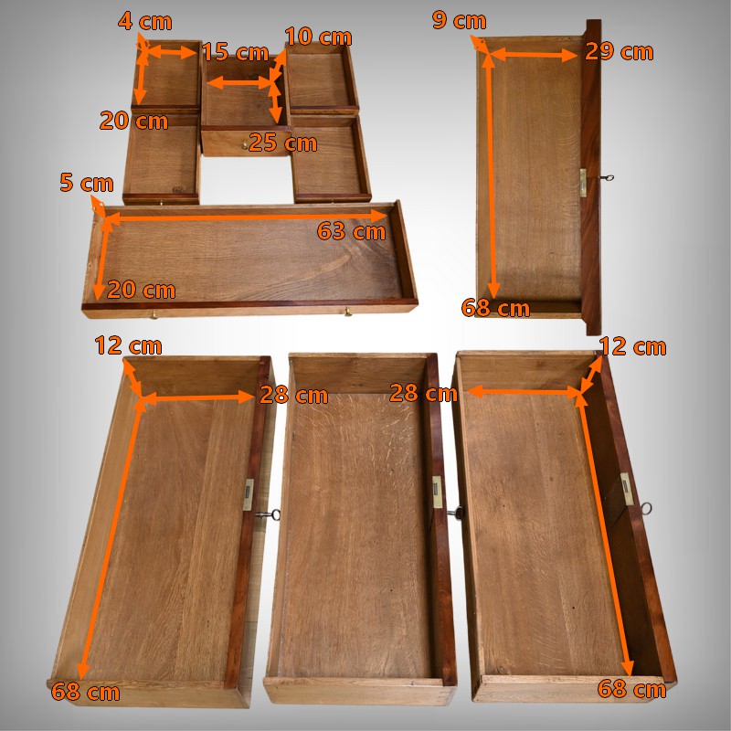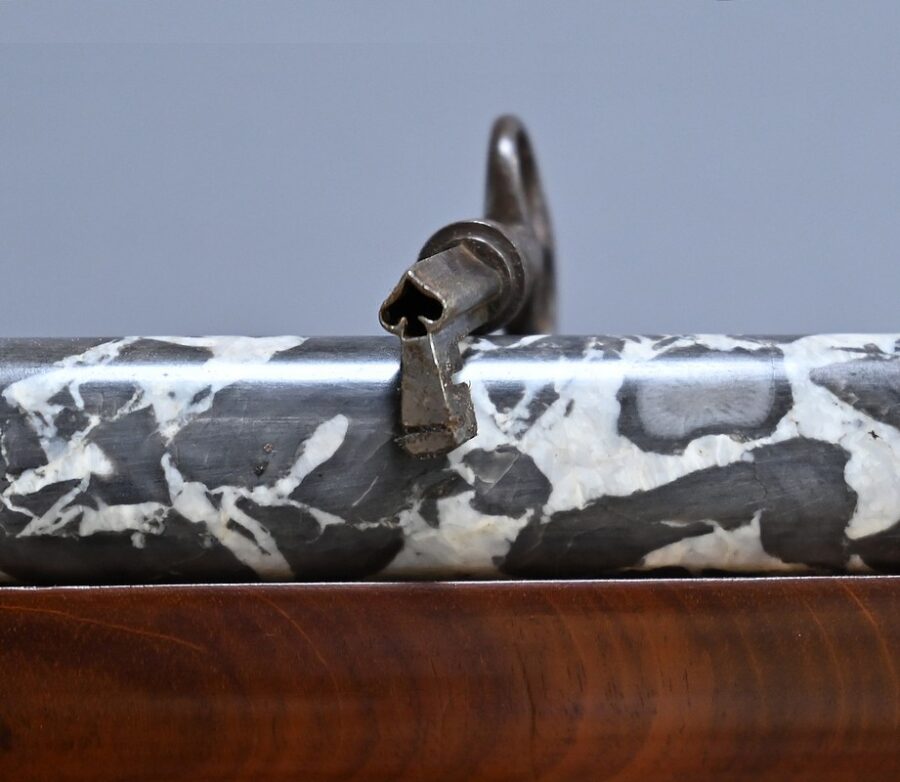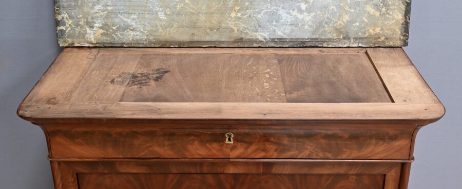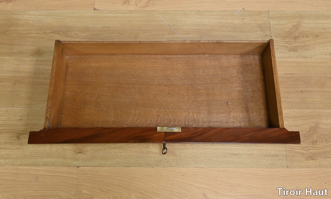 Ce secrétaire d’époque Restauration est une pièce réalisée en placage de ronce d’acajou aux reflets profonds et chaleureux. En partie haute, un tiroir en ceinture s’ouvre à l’aide d’une clé « pique », avec une serrure parfaitement fonctionnelle. L’abattant, plaqué de quatre feuilles de ronce d’acajou disposées à livre ouvert, s’ouvre pour révéler un cuir vert neuf, orné d’une vignette dorée et d’un motif central raffiné. À l’intérieur, un élégant tabernacle en érable moucheté dévoile une grande niche et six tiroirs de tailles variées, tous dotés de boutons en laiton finement ciselés. La partie basse du meuble propose trois grands tiroirs fermant à clé, ainsi qu’un tiroir dissimulé dans la plinthe, pour un rangement discret et ingénieux. Le tout est surmonté d’un marbre gris Saint Anne, sobre et noble, et repose sur des pieds boule écrasés à l’avant, typiques de l’époque. Ce meuble séduit par l’élégance de ses lignes, la richesse de ses matériaux et la subtilité de ses détails. Son cuir vert profond, ses multiples rangements et ses tiroirs secrets en font un meuble aussi pratique que décoratif. Un véritable coup de cœur pour les amateurs de mobilier ancien et de belles finitions.