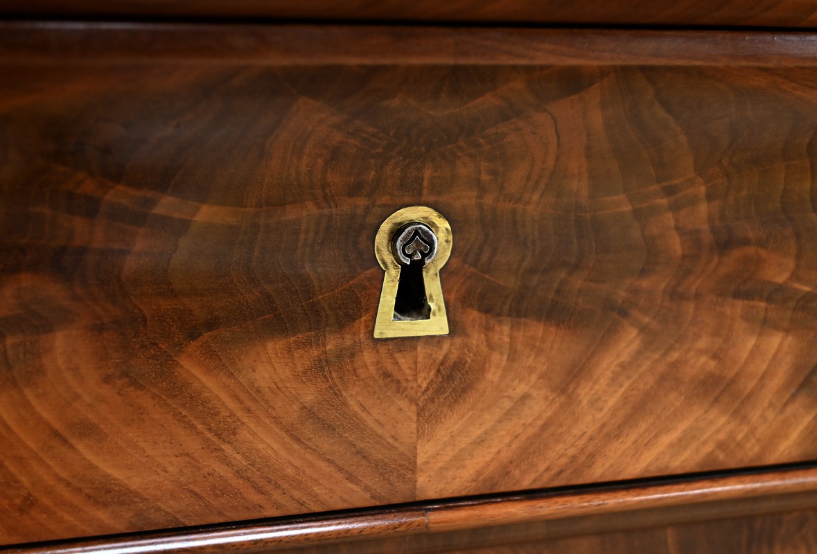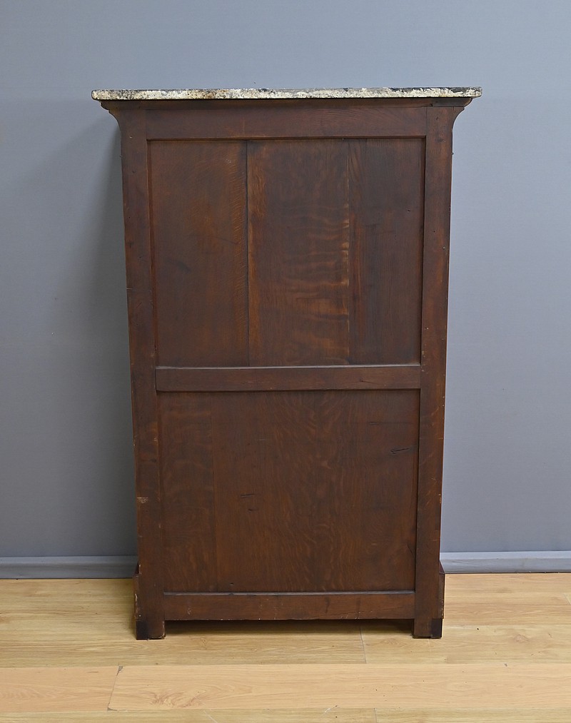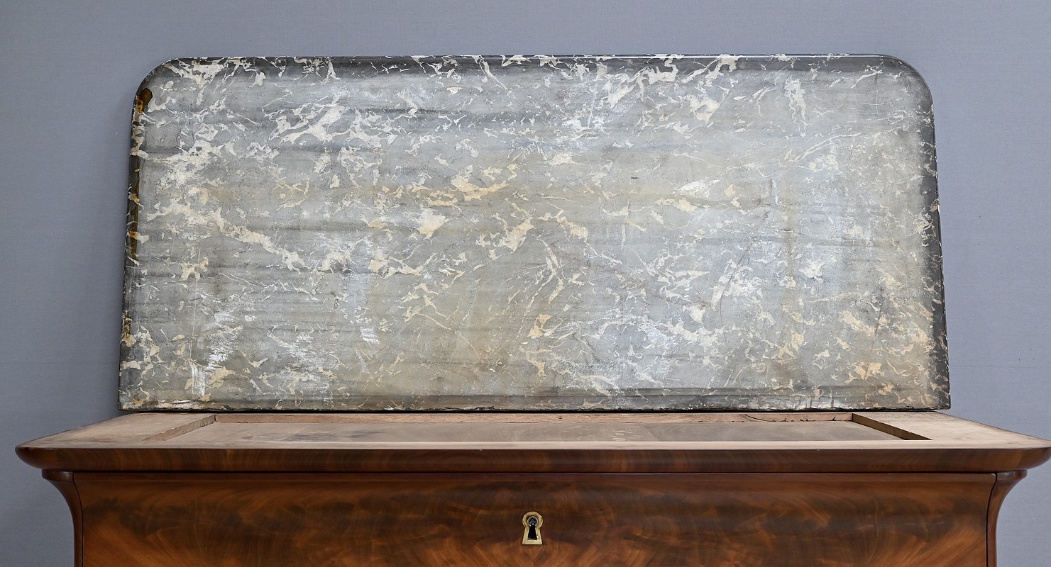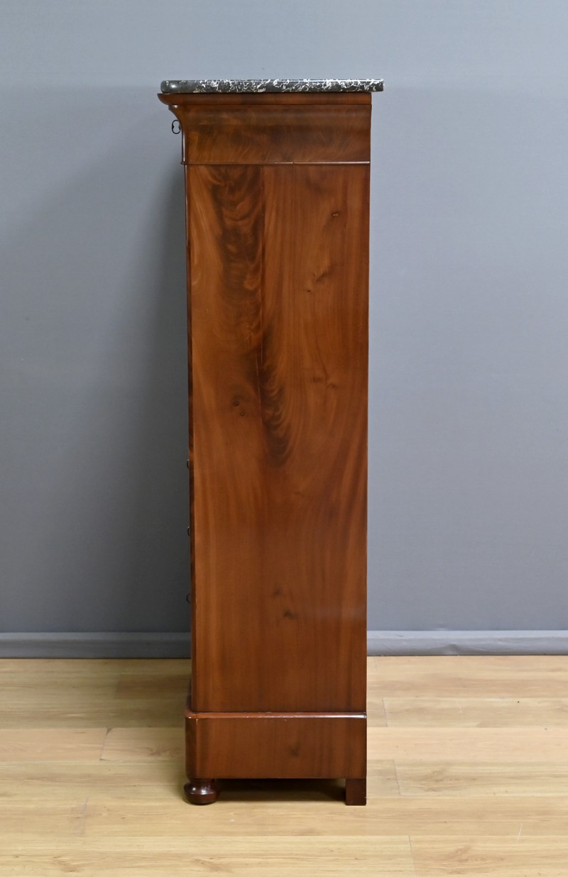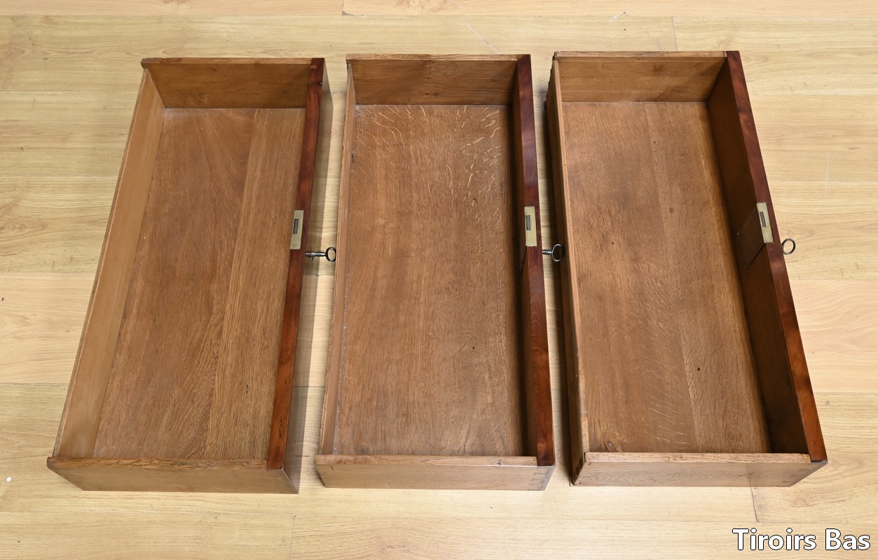 Ce secrétaire d’époque Restauration est une pièce réalisée en placage de ronce d’acajou aux reflets profonds et chaleureux. En partie haute, un tiroir en ceinture s’ouvre à l’aide d’une clé « pique », avec une serrure parfaitement fonctionnelle. L’abattant, plaqué de quatre feuilles de ronce d’acajou disposées à livre ouvert, s’ouvre pour révéler un cuir vert neuf, orné d’une vignette dorée et d’un motif central raffiné. À l’intérieur, un élégant tabernacle en érable moucheté dévoile une grande niche et six tiroirs de tailles variées, tous dotés de boutons en laiton finement ciselés. La partie basse du meuble propose trois grands tiroirs fermant à clé, ainsi qu’un tiroir dissimulé dans la plinthe, pour un rangement discret et ingénieux. Le tout est surmonté d’un marbre gris Saint Anne, sobre et noble, et repose sur des pieds boule écrasés à l’avant, typiques de l’époque. Ce meuble séduit par l’élégance de ses lignes, la richesse de ses matériaux et la subtilité de ses détails. Son cuir vert profond, ses multiples rangements et ses tiroirs secrets en font un meuble aussi pratique que décoratif. Un véritable coup de cœur pour les amateurs de mobilier ancien et de belles finitions.