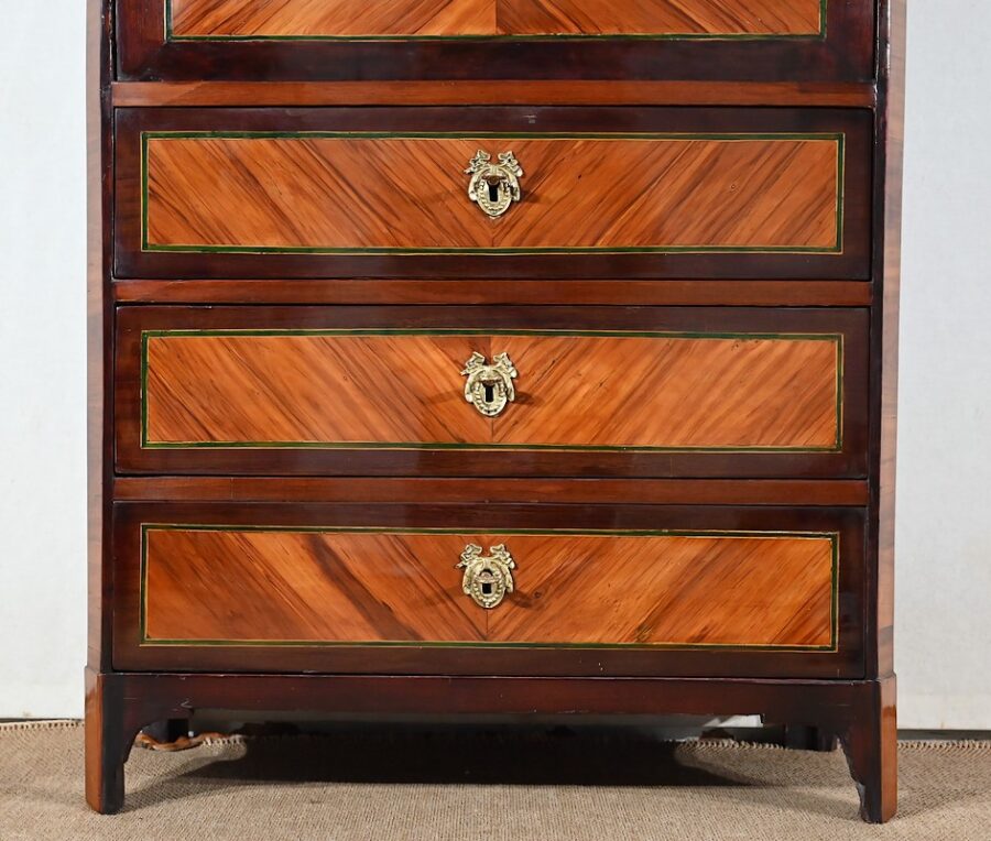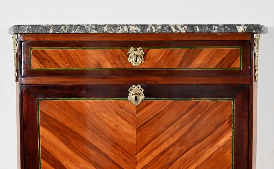 Ce meuble unique ouvre par un abattant, un tiroir en partie haute et trois identiques en partie basse. Chacun est muni d’une serrure fonctionnelle d’origine, d’une entrée en bronze ciselé et d’une clé postérieure. Les façades, en placage de bois de rose disposé en éventail, sont agrémentées de filets de bois teinté vert, de buis et d’entourages en acajou.