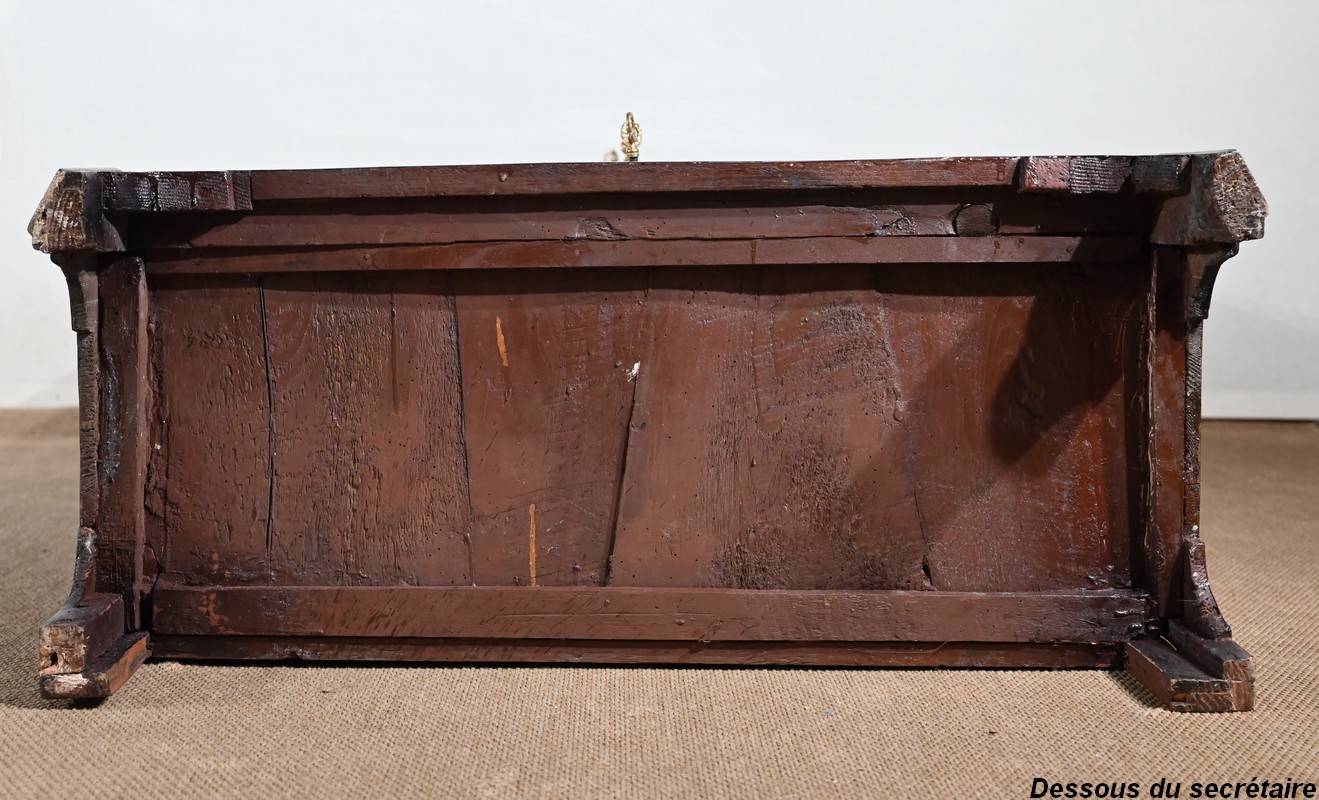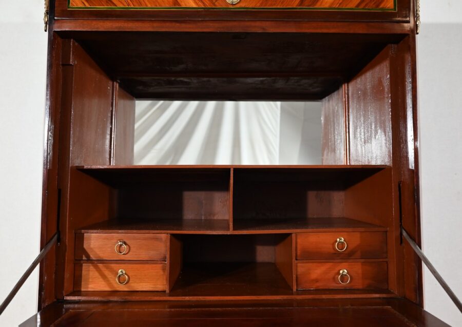 L’abattant ouvre sur un espace de rangement composé de quatre petits tiroirs et d’une niche, sommés de deux casiers et garni d’un miroir. La partie écritoire offre un cuir rouge, avec vignette dorée et liseré à froid. Cet abattant est maintenu par des crochets fer et des platines laiton.