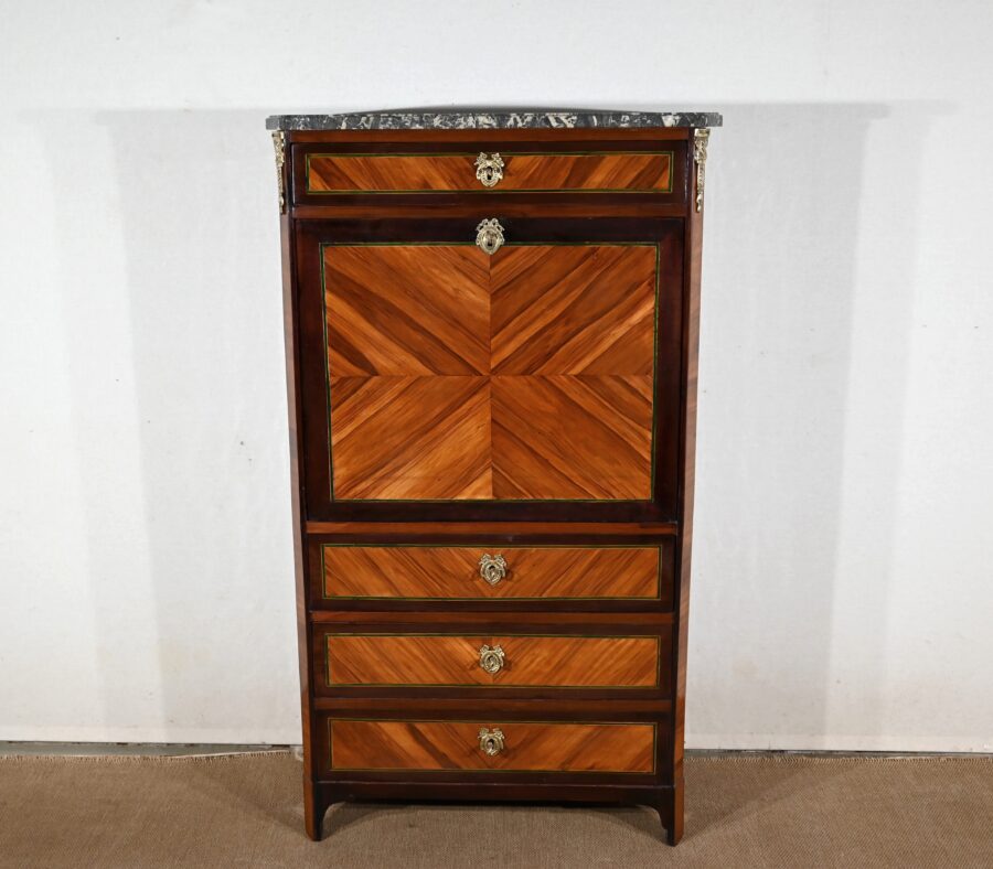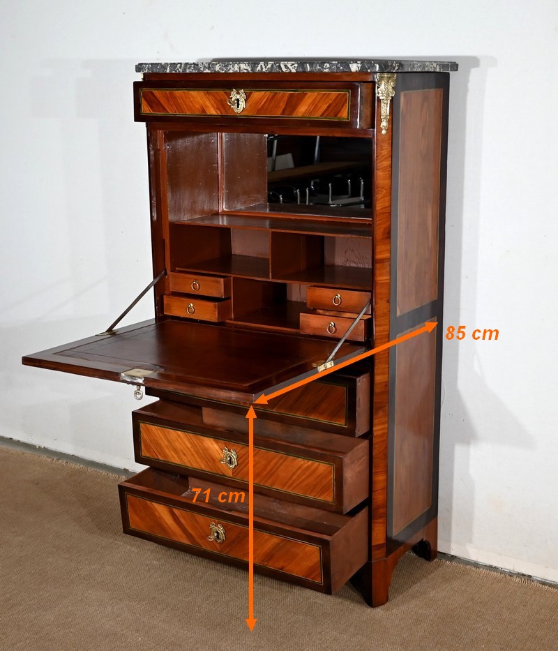 Secrétaire en placage de bois de rose surmonté d’un marbre « Sainte Anne des Pyrénées », à gorge, et d’époque.