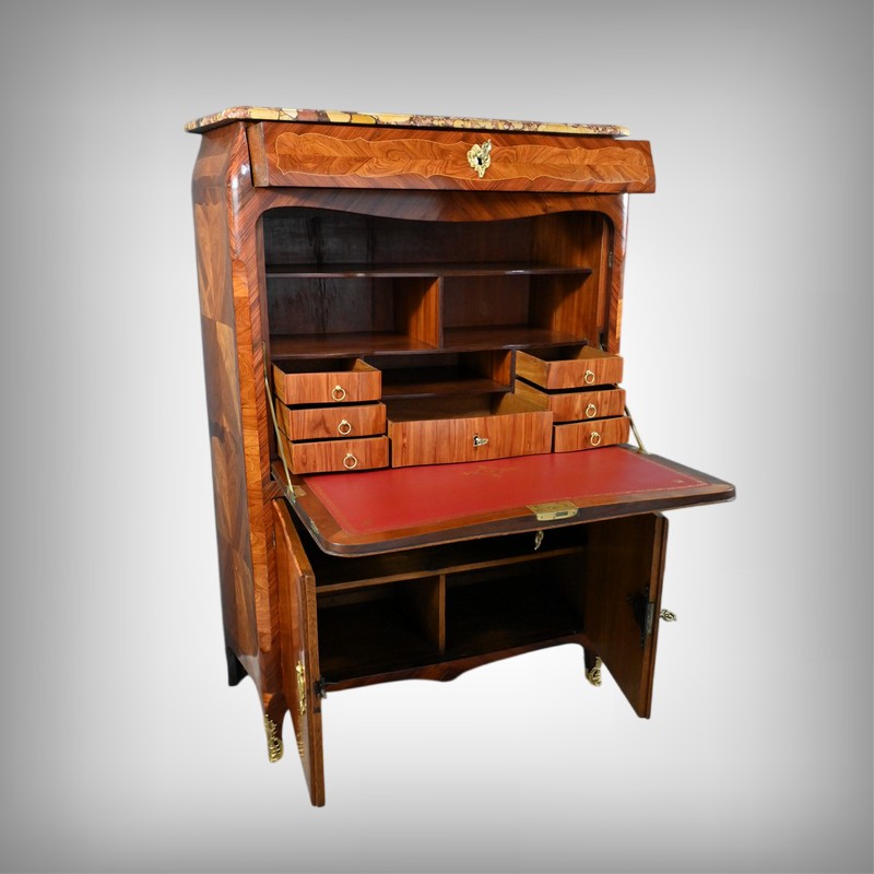 Témoin du goût et du savoir-faire artisanal du XVIIIe siècle, ce secrétaire n’est pas seulement un meuble fonctionnel, mais une véritable œuvre d’art, alliant beauté et utilité avec une rare finesse.