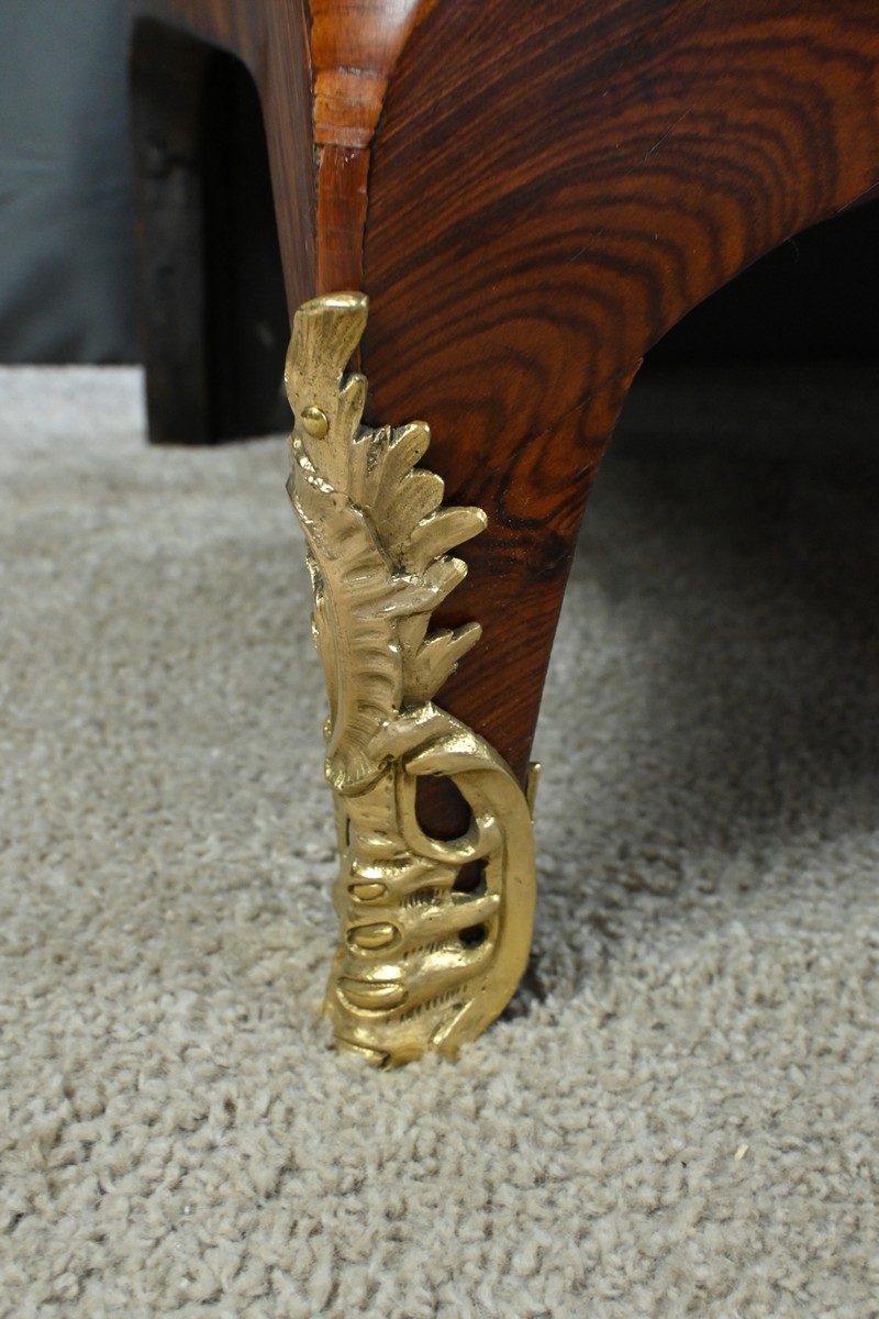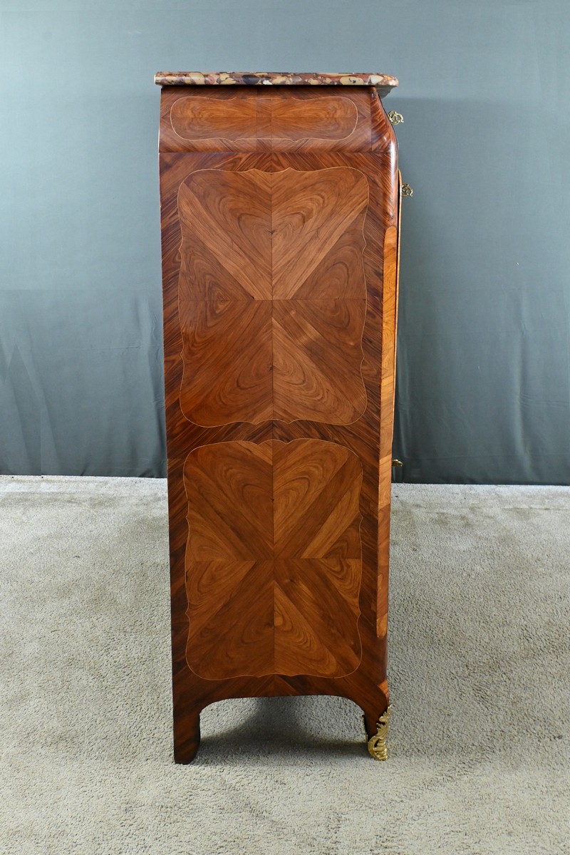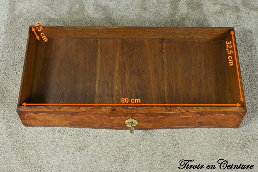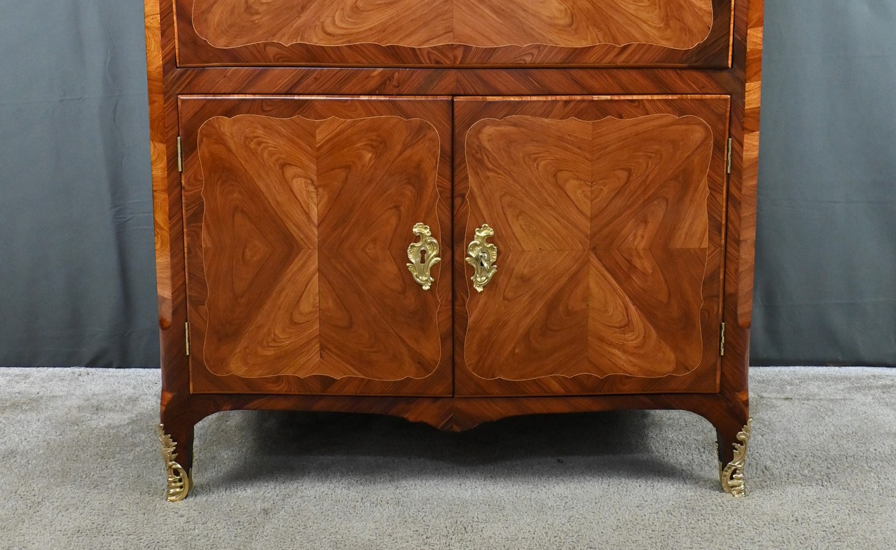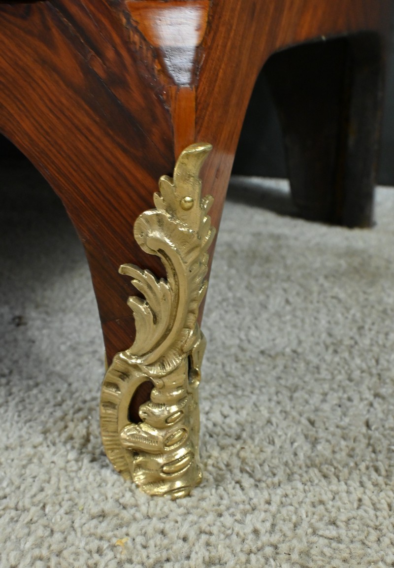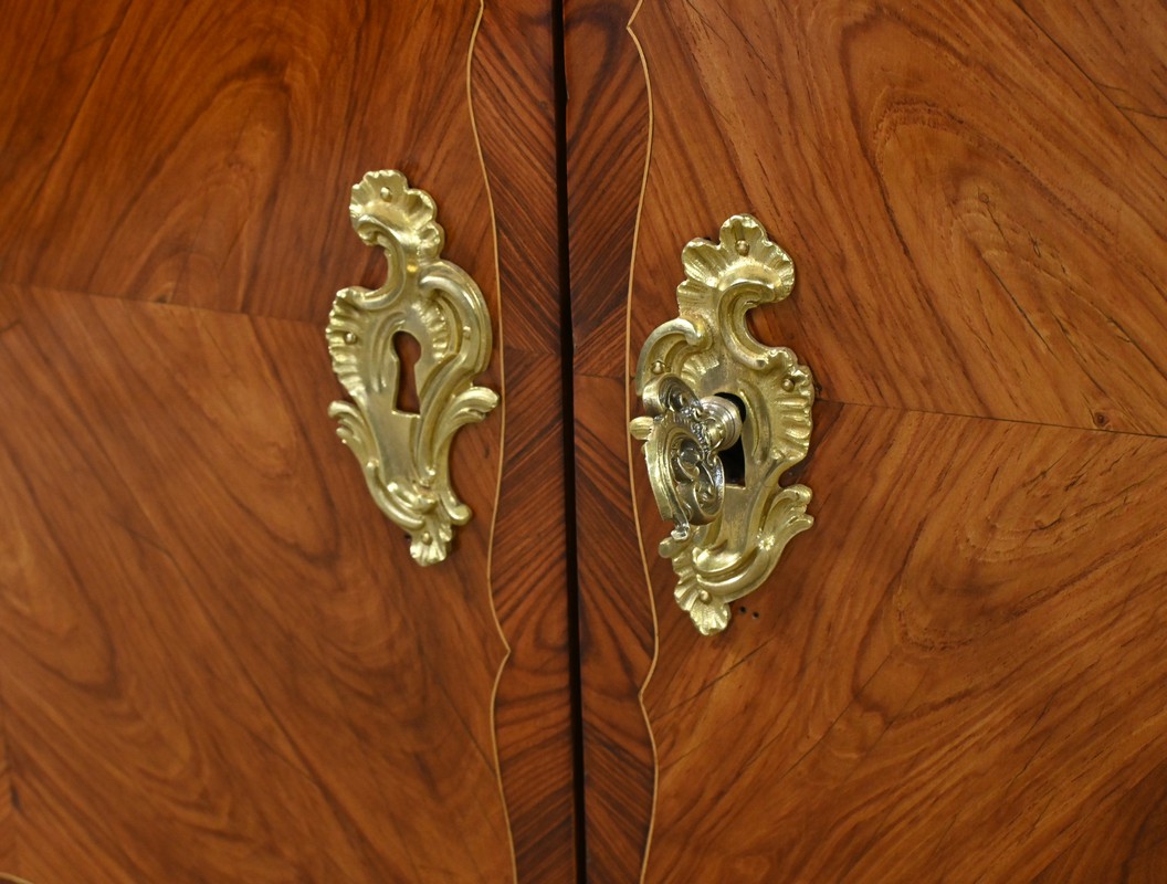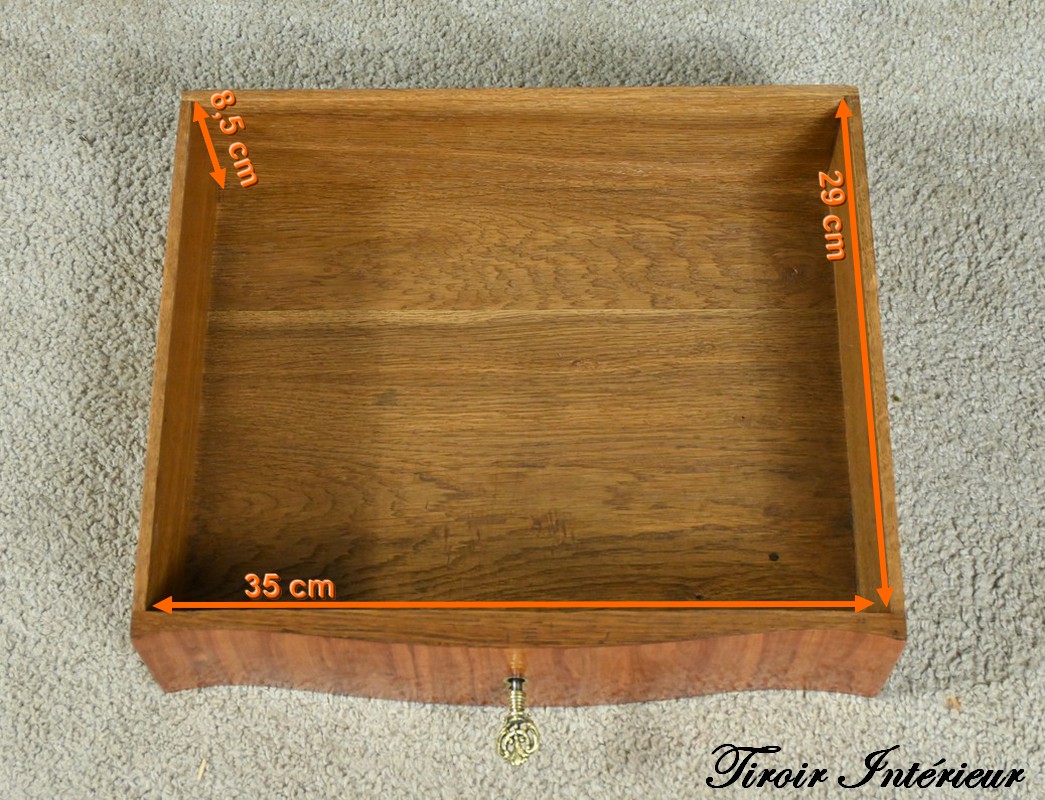 Enfin, ce meuble repose sur deux petits pieds galbés à l’avant, ornés de sabots en bronze, conférant à l’ensemble une allure gracieuse et équilibrée.