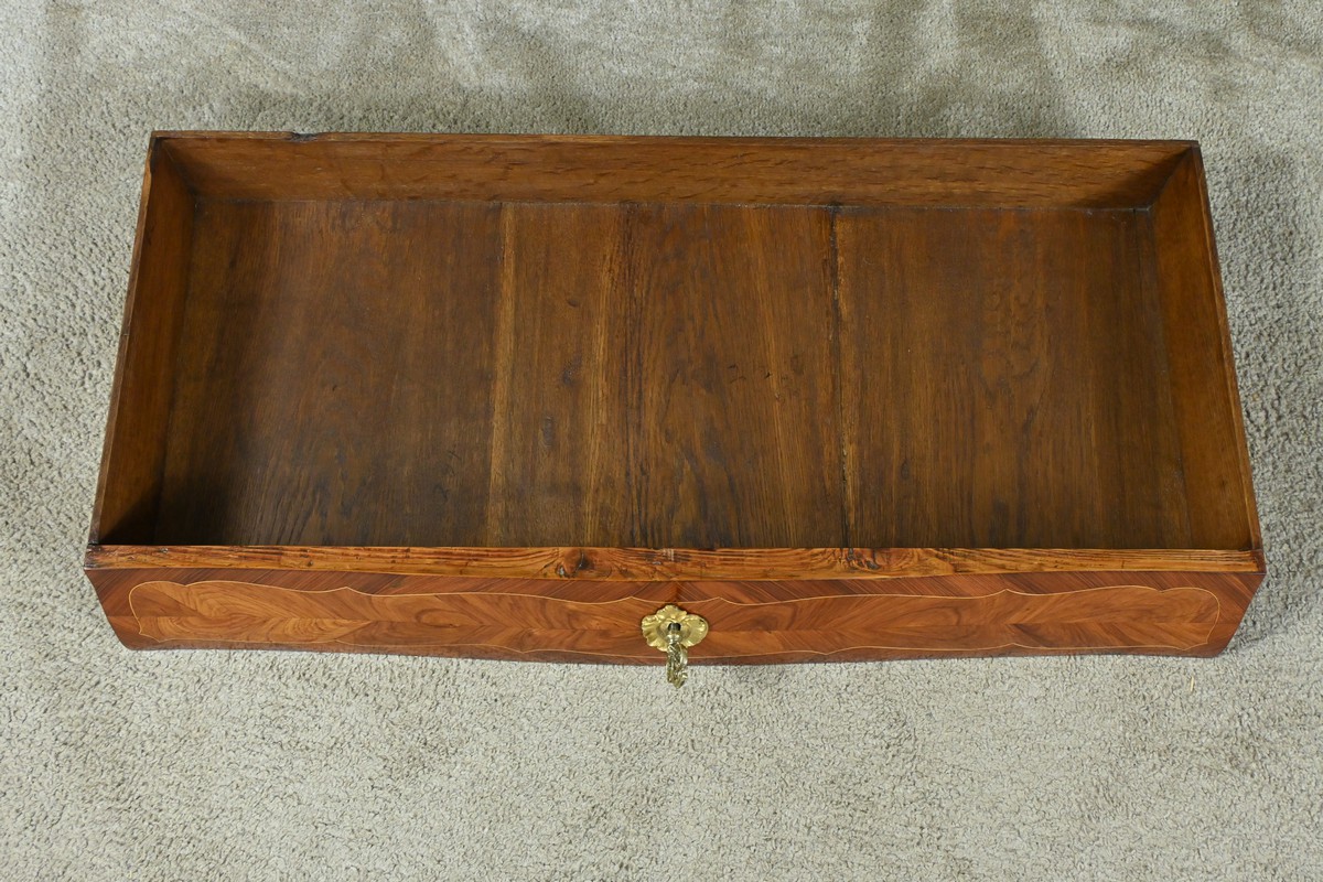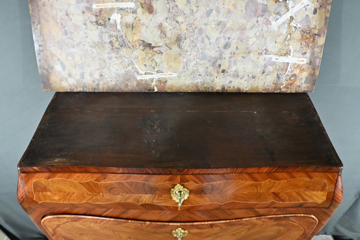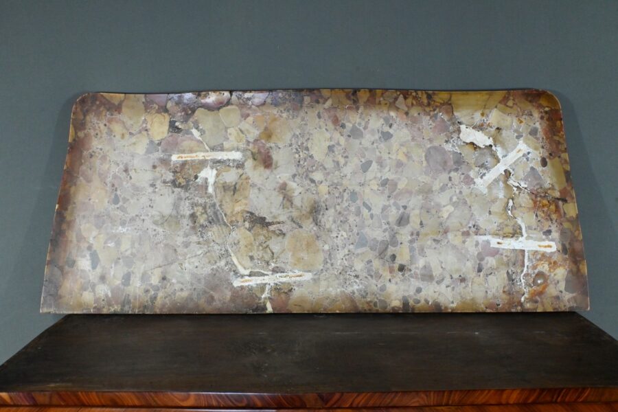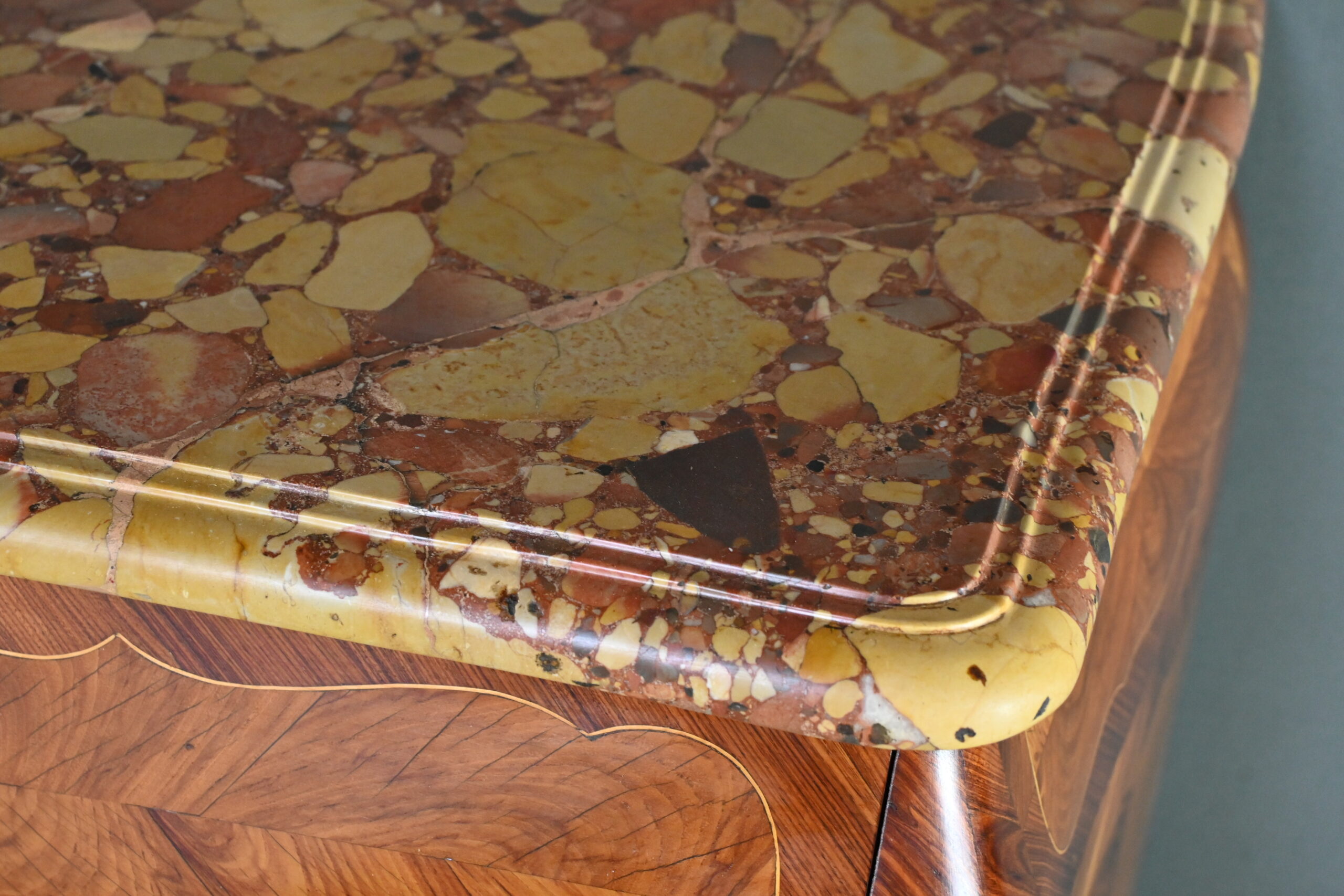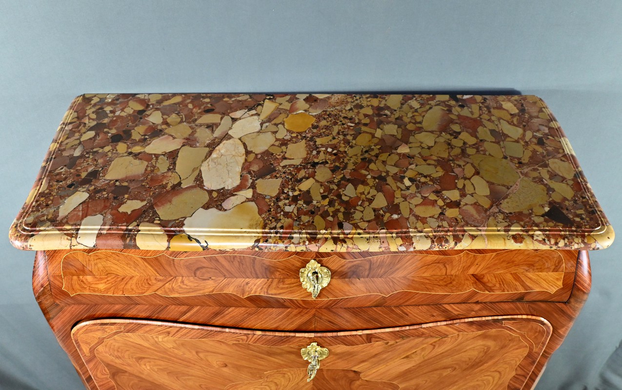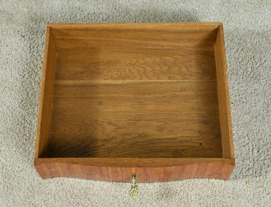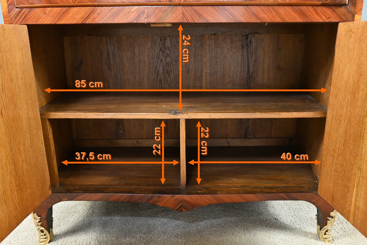 Enfin, ce meuble repose sur deux petits pieds galbés à l’avant, ornés de sabots en bronze, conférant à l’ensemble une allure gracieuse et équilibrée.