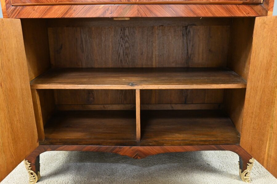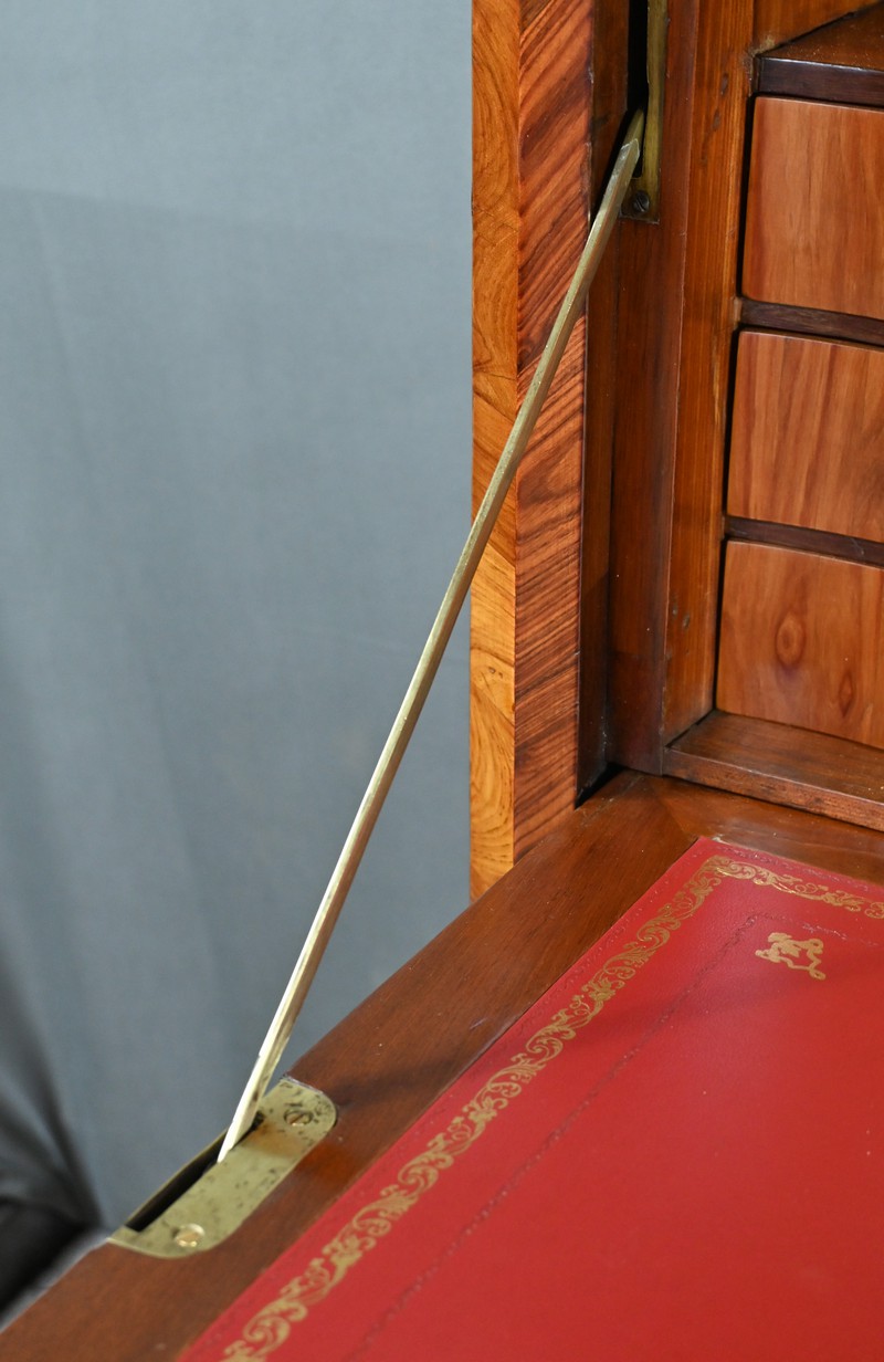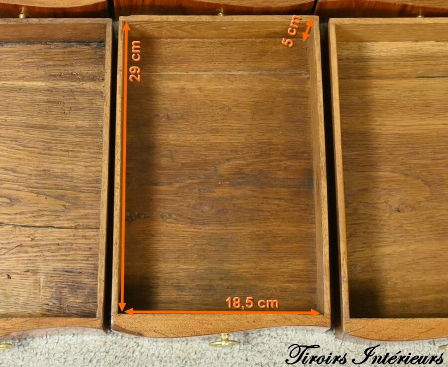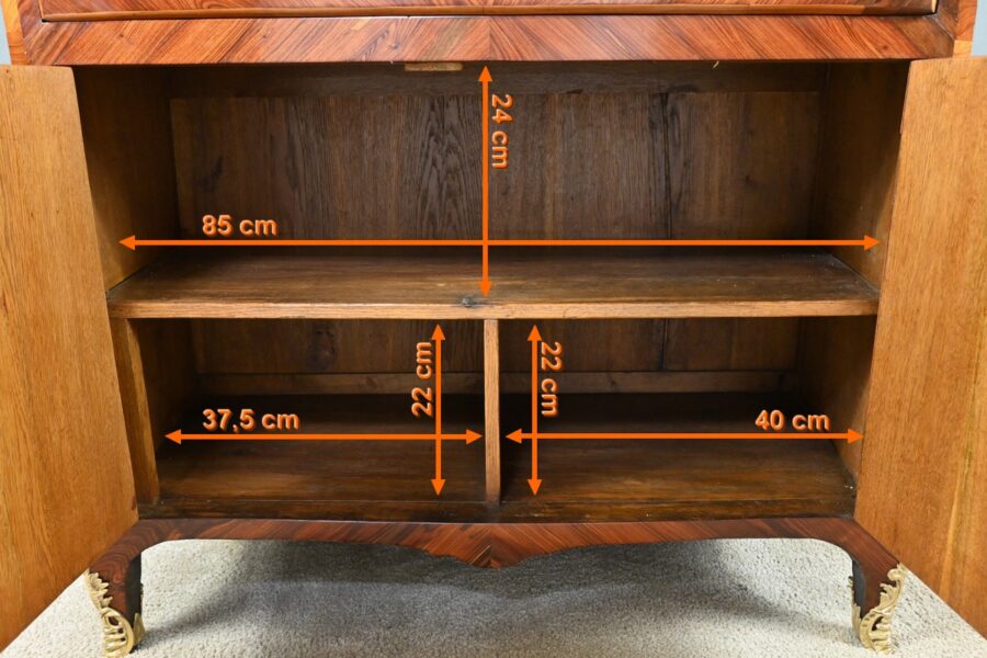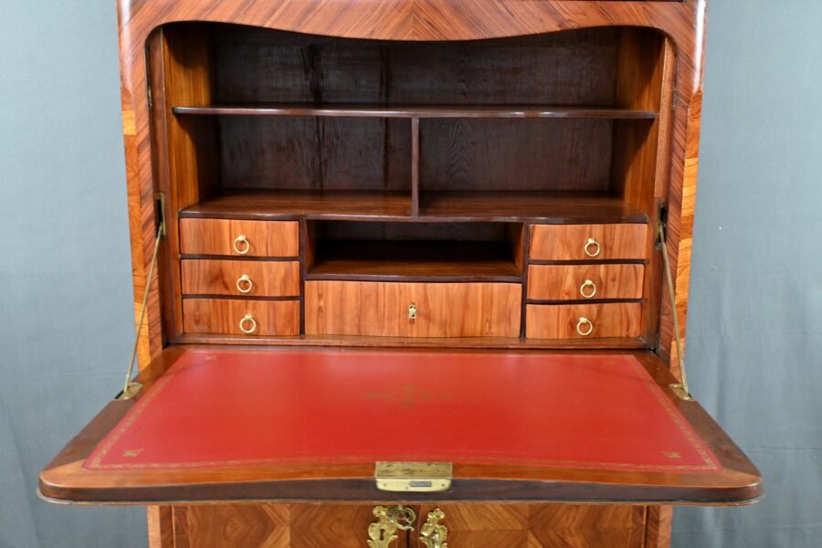En son centre, un abattant, habillé d’un somptueux cuir rouge postérieur, se déploie pour révéler une série de sept tiroirs finement agencés, dont six sont identiques, ainsi que des étagères compartimentées, parfaites pour organiser documents et objets précieux.