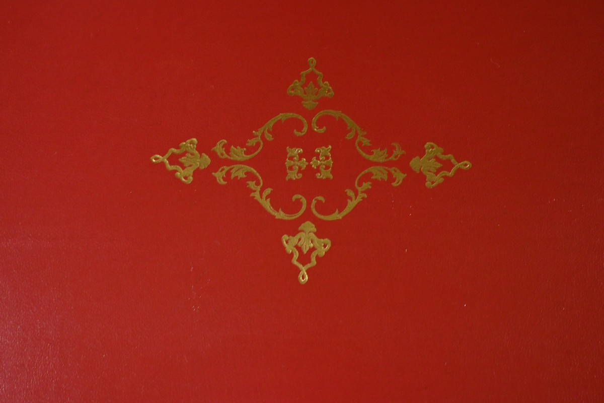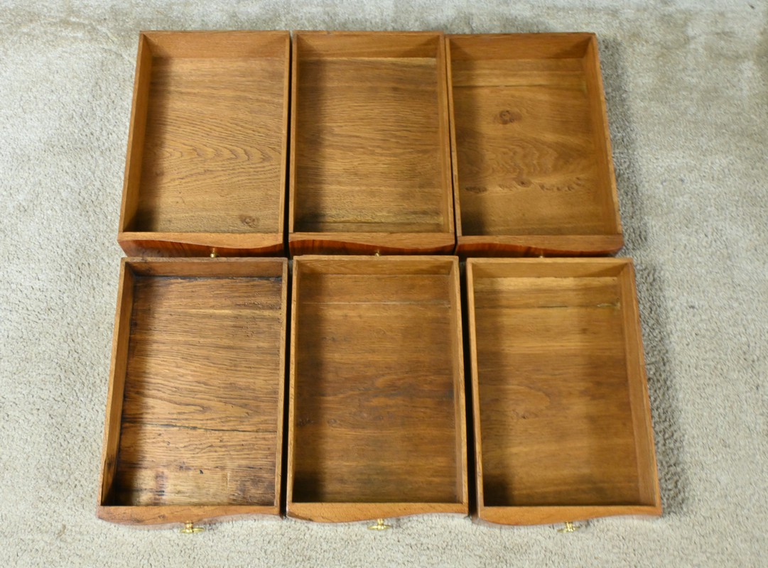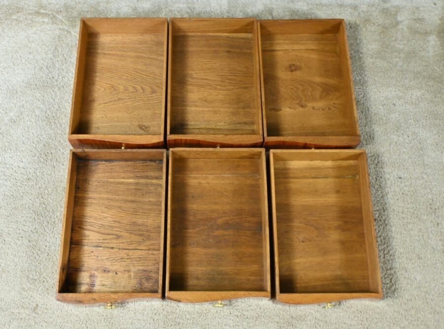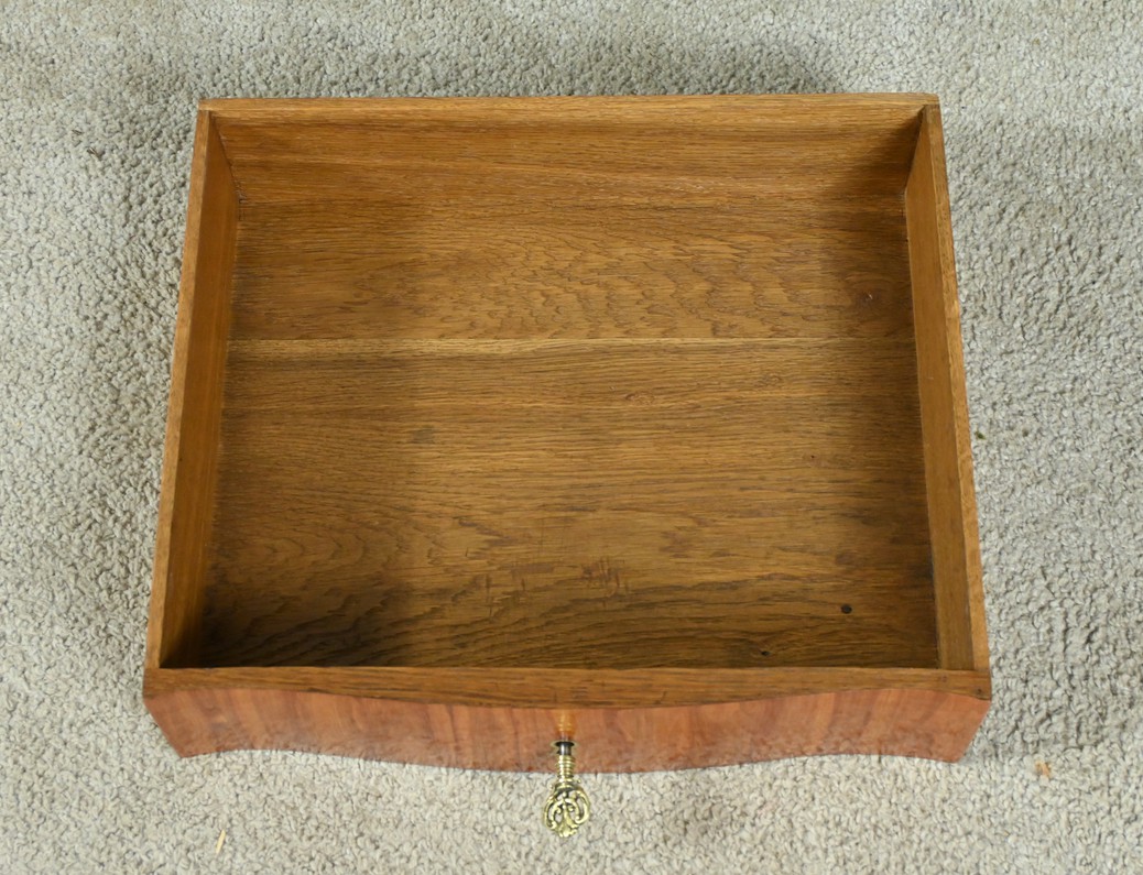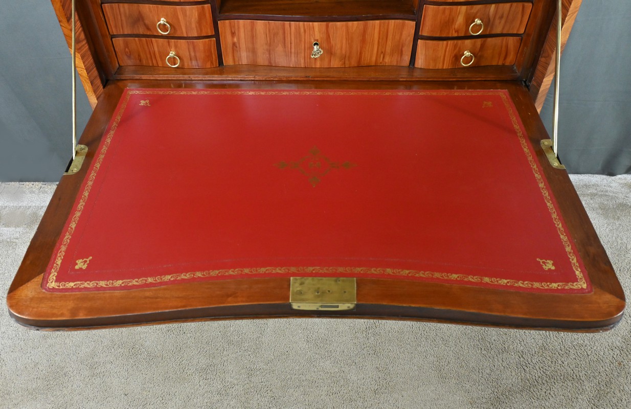 En son centre, un abattant, habillé d’un somptueux cuir rouge postérieur, se déploie pour révéler une série de sept tiroirs finement agencés, dont six sont identiques, ainsi que des étagères compartimentées, parfaites pour organiser documents et objets précieux.