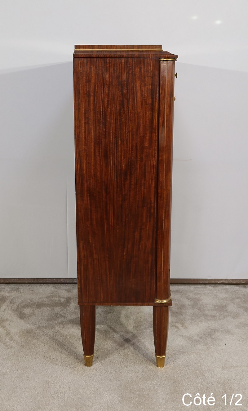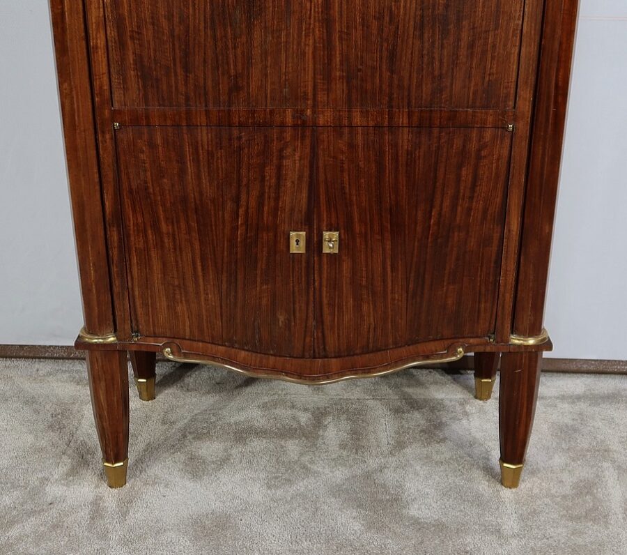 De chaque côté, ce secrétaire possède deux colonnes attachées à pans coupés, baguées en haut et en bas. Enfin, ce meuble repose sur des pieds à pan coupés également s’affinant vers le bas, accompagnés d’un sabot en bronze.