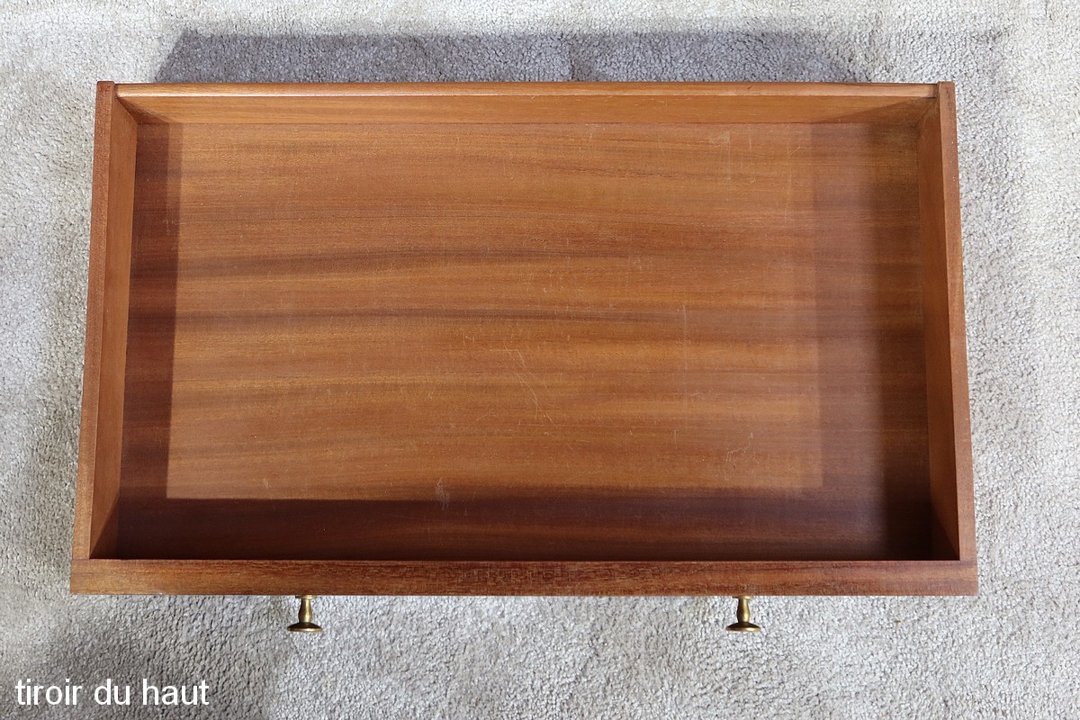 Ce mobilier de qualité aux lignes raffinées en placage d’acajou présente en partie haute un tiroir s’ouvrant avec deux boutons en laiton légèrement de forme cuvette.