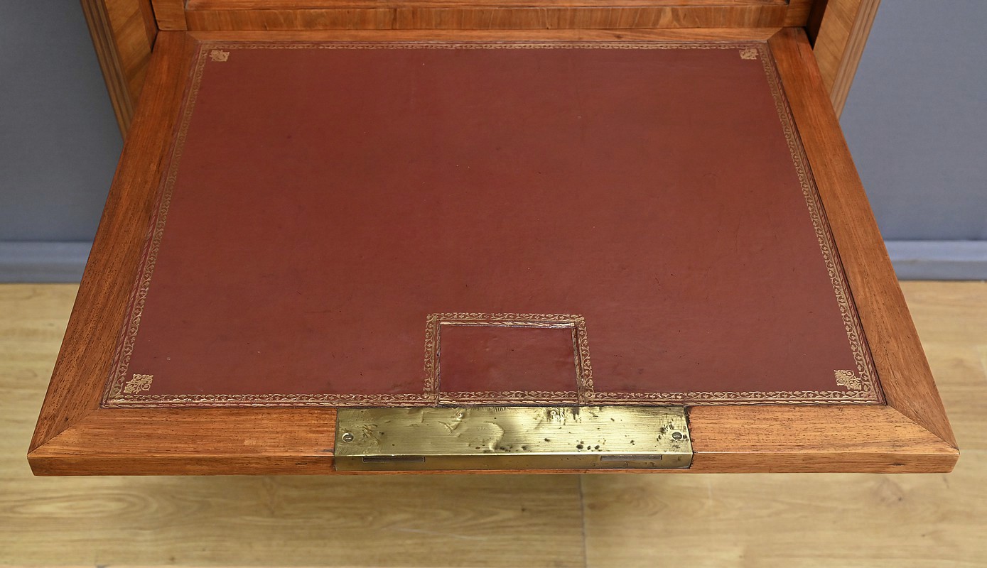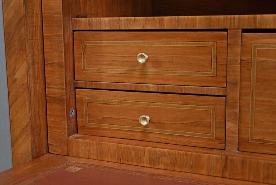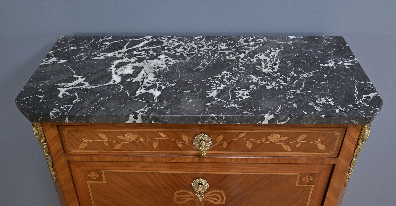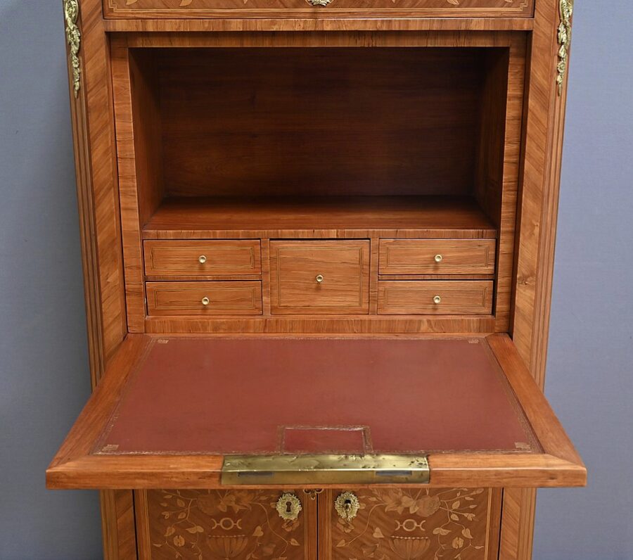 Ce charmant secrétaire de style Transition se distingue par son raffinement et son harmonie esthétique. Son tiroir en ceinture, agrémenté d’un placage de bois de rose, dévoile une marqueterie délicate de feuillage et de fleurs en bois clair, encadrée par un filet de bois teinté. Ce tiroir est équipé d’une serrure fonctionnelle avec entrée en bronze doré et clé. Juste en dessous, l’abattant, doté également de sa serrure d’origine, arbore une somptueuse marqueterie mettant en scène des instruments de musique, des partitions et des carquois, entourés de fleurs et rehaussés d’un ruban. Une fois ouvert, il révèle un intérieur habillé d’un cuir bordeaux à vignette dorée, complété par cinq tiroirs à boutons lentille et une vaste niche, offrant une organisation optimale. La partie inférieure du secrétaire est pourvue d’une double porte ornée de motifs de bouquets délicatement disposés dans des vases, dans un esprit décoratif en parfaite continuité avec l’ensemble. Elle comprend une serrure, des entrées en bronze doré et une clé, garantissant à la fois esthétisme et fonctionnalité. À l’intérieur, une étagère optimise l’espace de rangement. Les montants à pans coupés, réalisés en alternance de bois de rose et bois teinté, sont magnifiés par des chutes florales en bronze doré. Le meuble repose sur de petits pieds cambrés, eux aussi garnis de bronze, lui conférant une allure gracieuse et équilibrée. Les côtés se parent de panneaux en placage de bois de rose, disposés en ailes de papillon et rehaussés d’un décor floral en bois clair. Couronnant cette pièce d’exception, un élégant marbre gris veiné de blanc à pans coupés vient parfaire son allure sophistiquée. Ce secrétaire séduira par ses proportions harmonieuses, ses espaces de rangement ingénieux et son élégance intemporelle.
