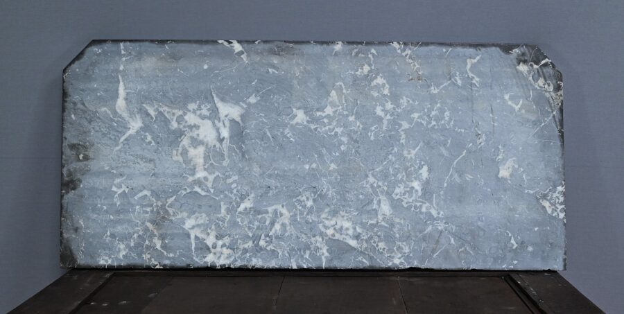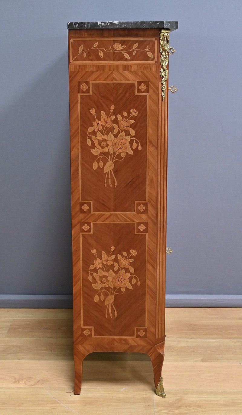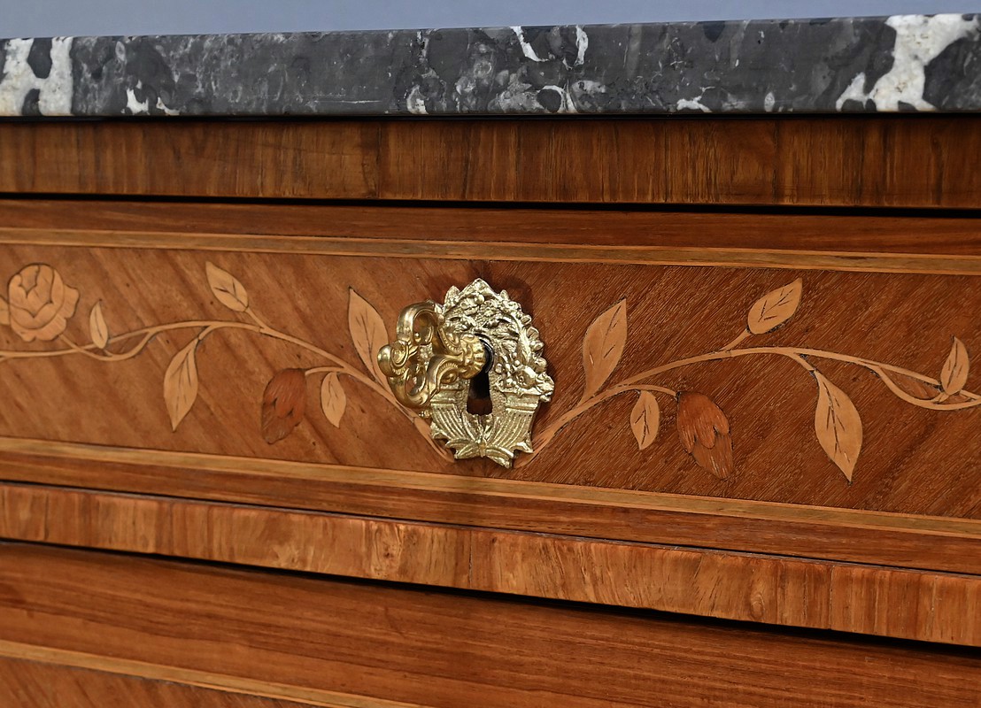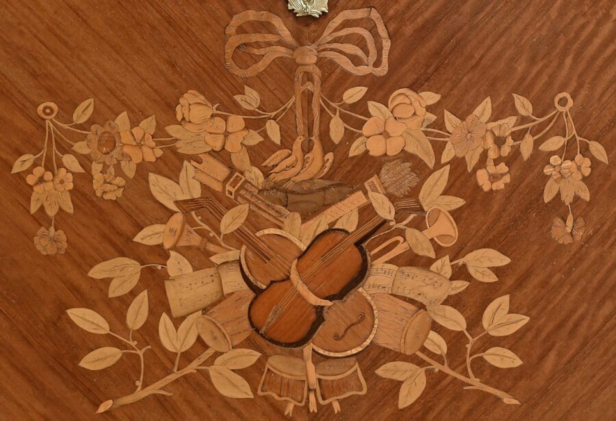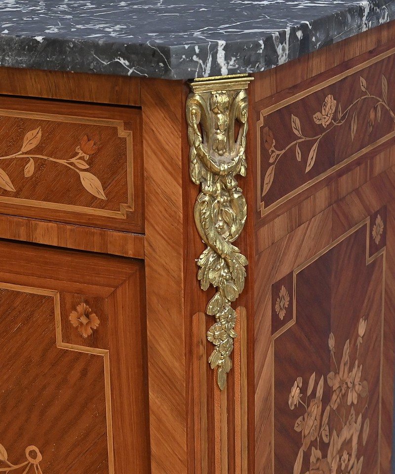 Ce charmant secrétaire de style Transition se distingue par son raffinement et son harmonie esthétique. Son tiroir en ceinture, agrémenté d’un placage de bois de rose, dévoile une marqueterie délicate de feuillage et de fleurs en bois clair, encadrée par un filet de bois teinté. Ce tiroir est équipé d’une serrure fonctionnelle avec entrée en bronze doré et clé. Juste en dessous, l’abattant, doté également de sa serrure d’origine, arbore une somptueuse marqueterie mettant en scène des instruments de musique, des partitions et des carquois, entourés de fleurs et rehaussés d’un ruban. Une fois ouvert, il révèle un intérieur habillé d’un cuir bordeaux à vignette dorée, complété par cinq tiroirs à boutons lentille et une vaste niche, offrant une organisation optimale. La partie inférieure du secrétaire est pourvue d’une double porte ornée de motifs de bouquets délicatement disposés dans des vases, dans un esprit décoratif en parfaite continuité avec l’ensemble. Elle comprend une serrure, des entrées en bronze doré et une clé, garantissant à la fois esthétisme et fonctionnalité. À l’intérieur, une étagère optimise l’espace de rangement. Les montants à pans coupés, réalisés en alternance de bois de rose et bois teinté, sont magnifiés par des chutes florales en bronze doré. Le meuble repose sur de petits pieds cambrés, eux aussi garnis de bronze, lui conférant une allure gracieuse et équilibrée. Les côtés se parent de panneaux en placage de bois de rose, disposés en ailes de papillon et rehaussés d’un décor floral en bois clair. Couronnant cette pièce d’exception, un élégant marbre gris veiné de blanc à pans coupés vient parfaire son allure sophistiquée. Ce secrétaire séduira par ses proportions harmonieuses, ses espaces de rangement ingénieux et son élégance intemporelle.