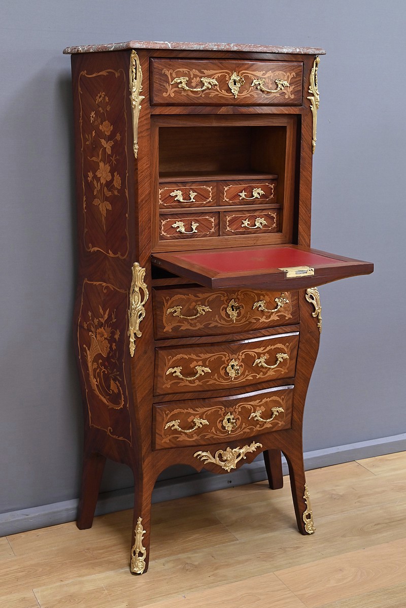 Superbe secrétaire d’époque Napoléon III, de style Transition, en placage de palissandre sublimé par une marqueterie de bois de rose et de bois clair à décor floral. Il s’organise en quatre tiroirs à traverses apparentes et un abattant central découvrant une niche et trois tiroirs. L’abattant, revêtu d’un cuir rouge neuf orné d’une vignette à froid et d’un élégant motif doré central, allie confort d’écriture et prestige esthétique. Les montants et pieds galbés sont rehaussés de chutes et de garnitures en bronze finement ciselées, tandis qu’une parure en bronze souligne la traverse basse du meuble. L’ensemble est couronné d’un marbre rouge royal, qui épouse avec grâce les lignes galbées du meuble. Toutes les serrures sont d’origine, parfaitement fonctionnelles, accompagnées de superbes entrées ouvragées et de clés finement travaillées. Une pièce remarquable, témoin de la qualité de l’artisanat français du XIXe siècle.