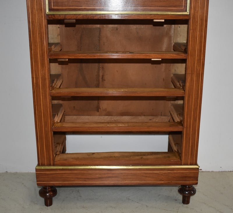 Il ouvre par un tiroir en partie haute, un abattant et 4 tiroirs en partie basse dont les intérieurs sont en acajou , chaque élément est encadré d’une moulure en laiton.