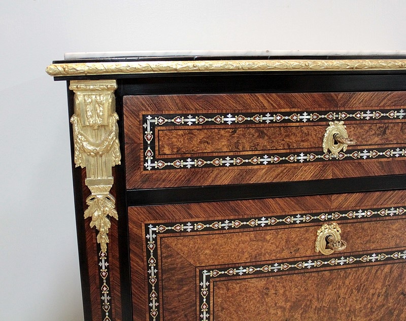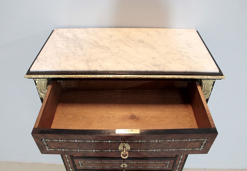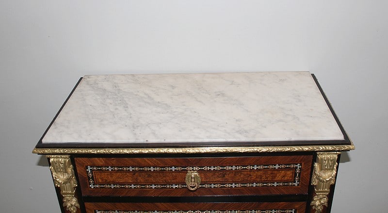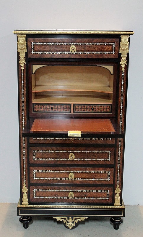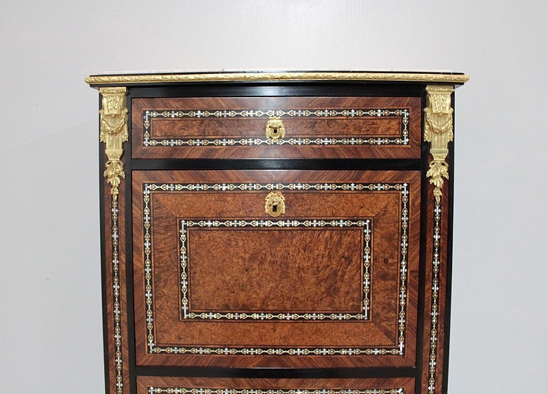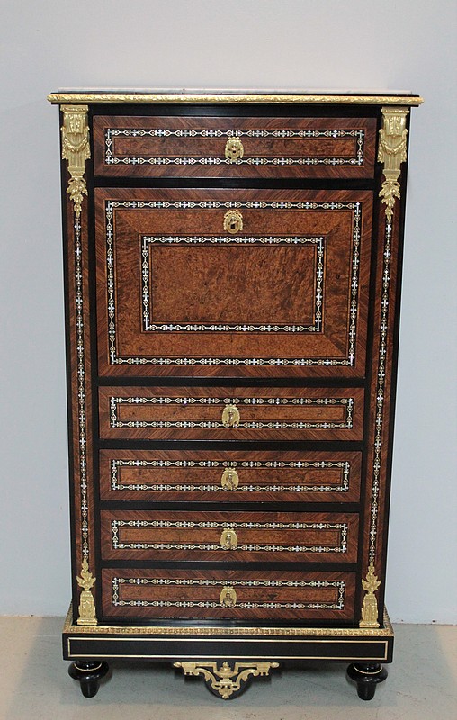 Secrétaire Napoléon III, dessus de marbre blanc veiné gris encadré d’une moulure de bronze ciselé doré.