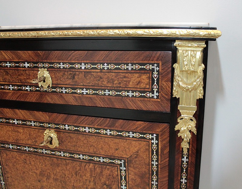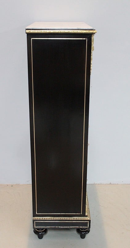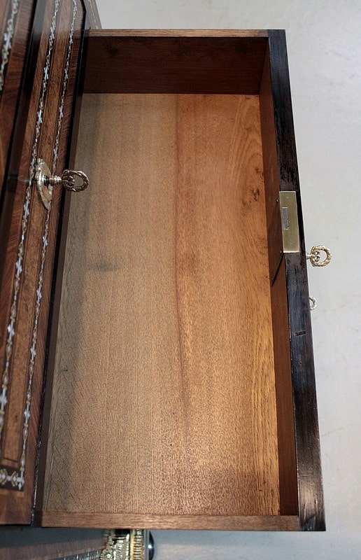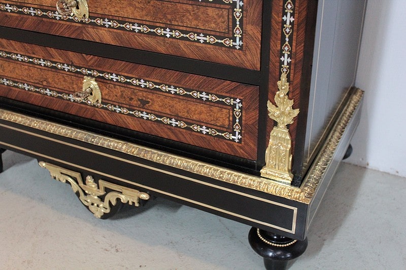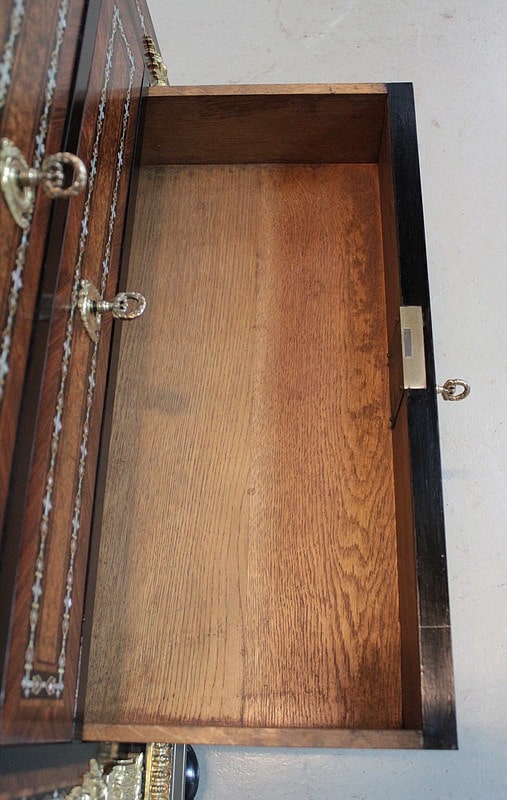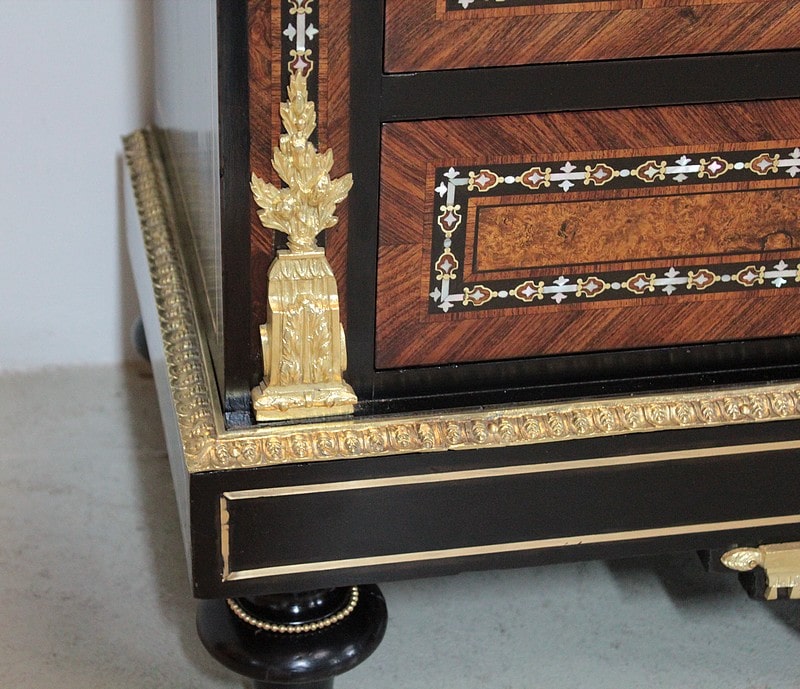 Ses côtés sont en poirier noirci et sa façade en loupe de thuya avec encadrement de palissandre et