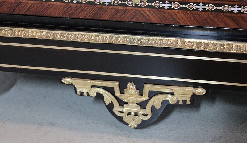 de nombreuses incrustations de nacre et de laiton sur fond d’ébène.