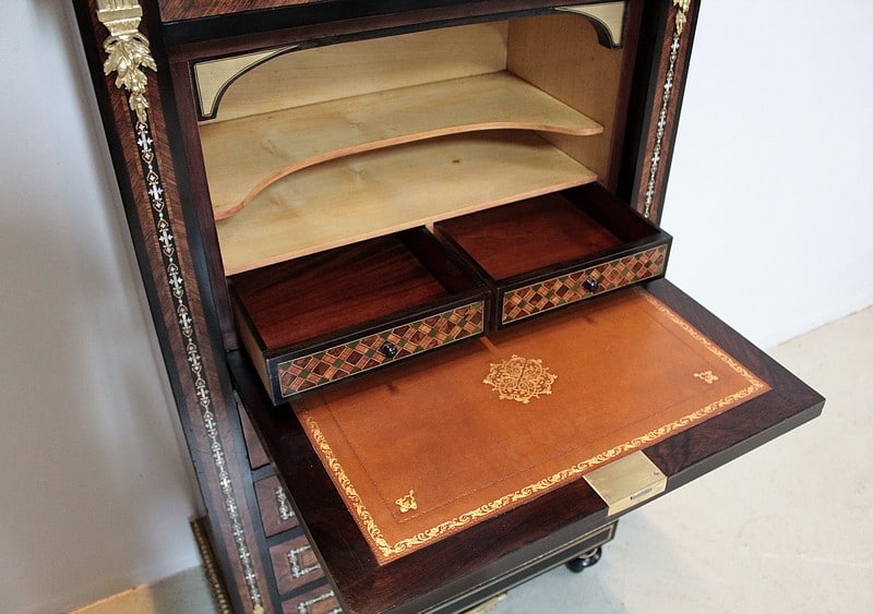 L’abattant, dont l’entourage est en palissandre, est gainé d’un cuir gold qui a été changé. Il découvre un théâtre en citronnier avec une étagère et deux petits tiroirs dont la façade est en marqueterie de thuya, de bois de rose et de bois teinté vert , leur intérieur est en acajou..