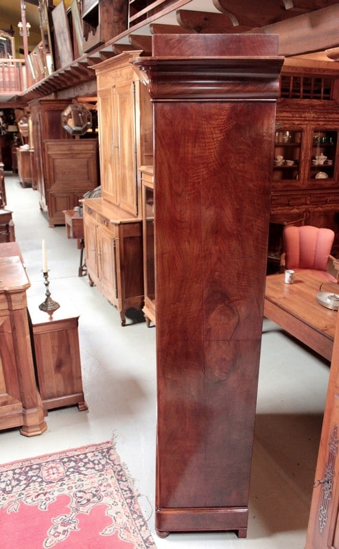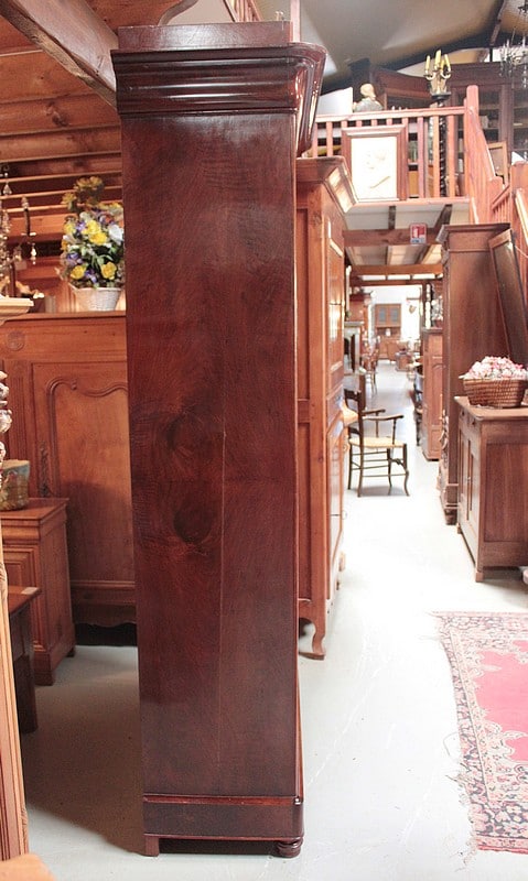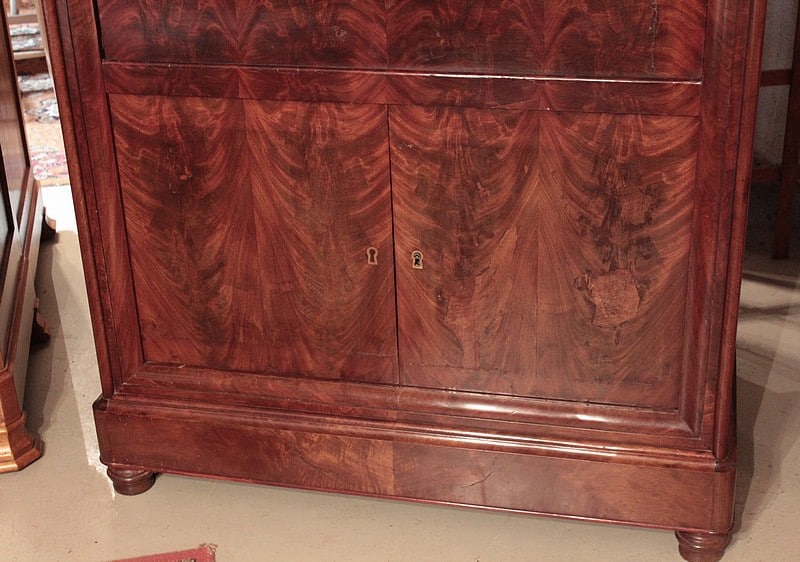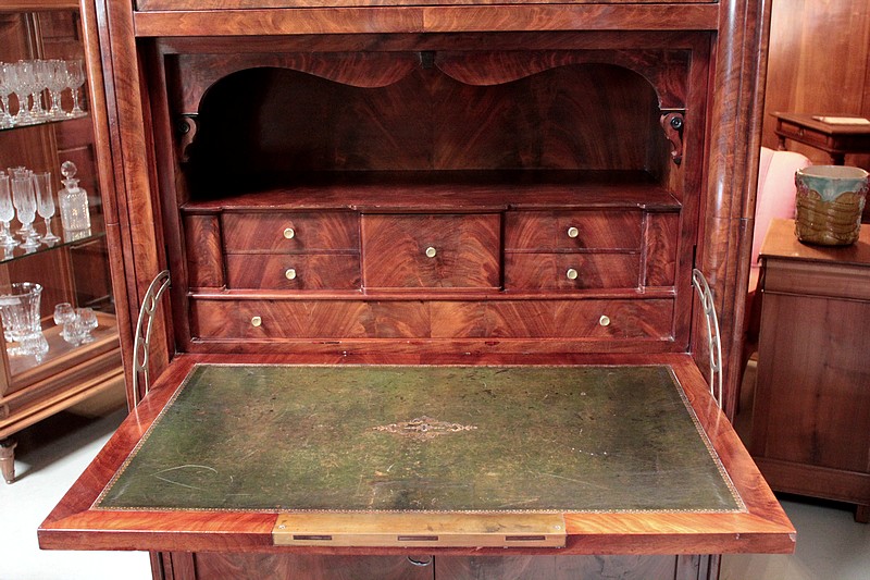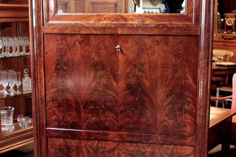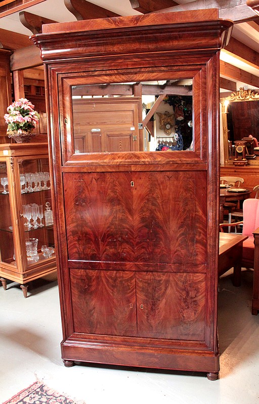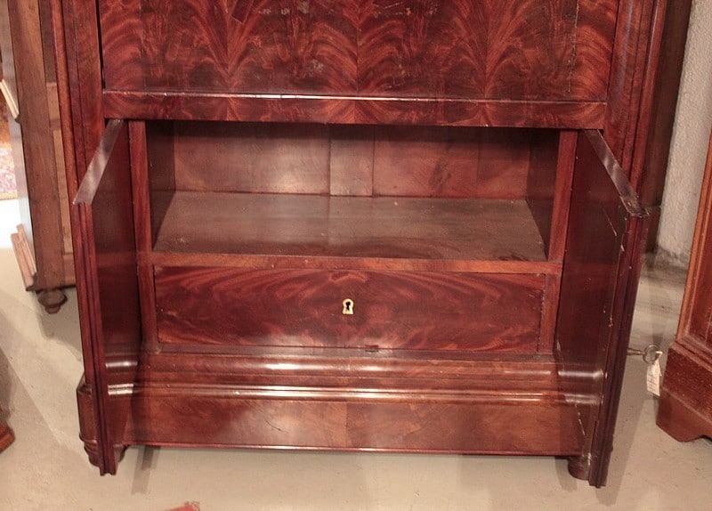 Secrétaire dit ‘Guillotine’ Restauration en placage d’acajou. Il ouvre par une porte à glace en partie haute, un abattant au milieu et 2 portes en partie basse, renfermant un tiroir. Le théâtre est garni de 6 tiroirs de dimensions différentes et l’abattant est recouvert d’un cuir vert d’origine.. Pieds boule à l’avant et droits à l’arrière. Clé trèfle.