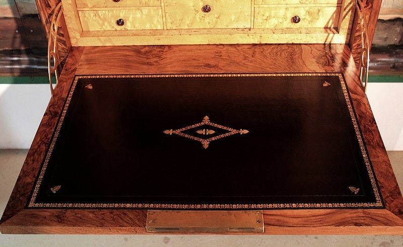 L’abattant, recouvert d’un cuir noir changé, découvre un théâtre en moucheté d’érable clair garni de 6 petits tiroirs aux dimensions diverses, avec boutons en palissandre.