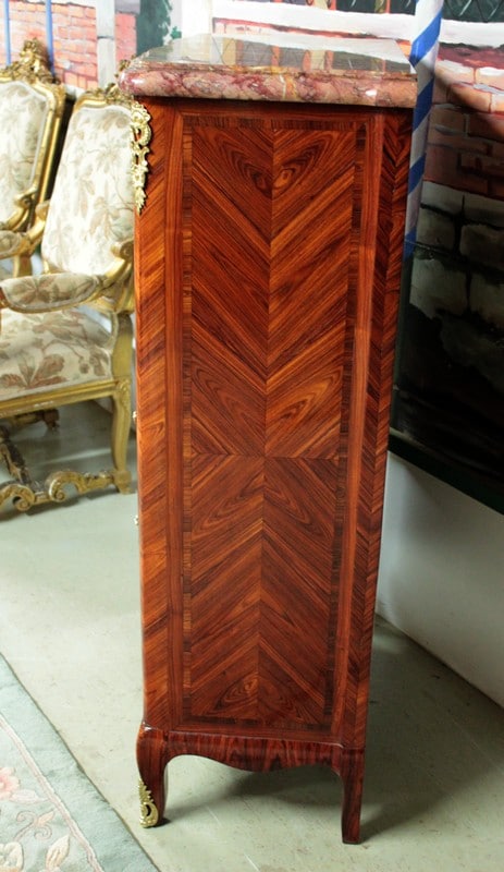 Petit secrétaire de dame de style Louis XV en bois de rose avec filet d’amarante sur les portes. Sa façade est légèrement mouvementée et il ouvre par un abattant, une tirette recouverte de cuir d’origine, et deux petites portes. L’abattant, recouvert de son cuir d’origine, découvre un intérieur en acajou avec casiers et 4 petits tiroirs. Il repose sur des pieds cambrés et est garni de bronzes dorés et ciselés de fleurs. Son dessus est en marbre mouluré très épais de couleur ocre. Sur le haut de deux montants, en diagonale, sous le marbre, une signature ‘LE FLOCH’. Finition verni au tampon. Époque : milieu du XIXe.