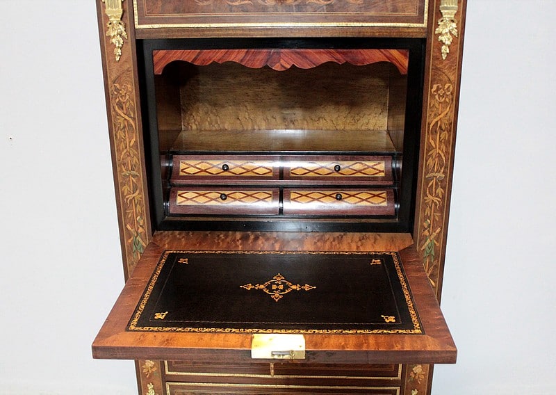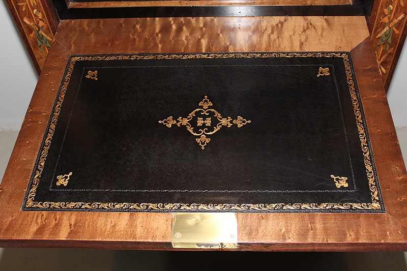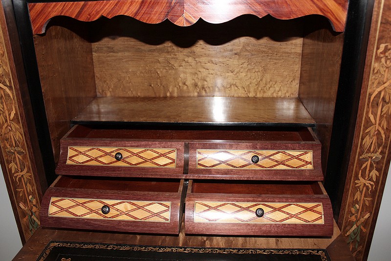 L’abattant, recouvert d’un cuir noir (changé), découvre un théâtre en moucheté d’érable avec fronton en bois de rose composé d’un casier et de 4 tiroirs en acajou marquetés de citronnier et de bois de rose en losanges