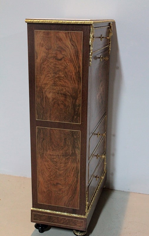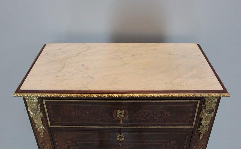 Petit Secrétaire en marqueterie de noyer et acajou avec filets de bois de rose, de citronnier et de bois teintés dans l’esprit Louis XVI, époque NAPOLÉON III. Dessus de marbre blanc veiné.
