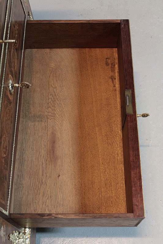 Nombreuses garnitures de bronze : moulures autour du marbre, du socle et des tiroirs, chutes, entrées de serrures.