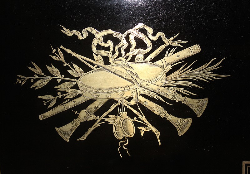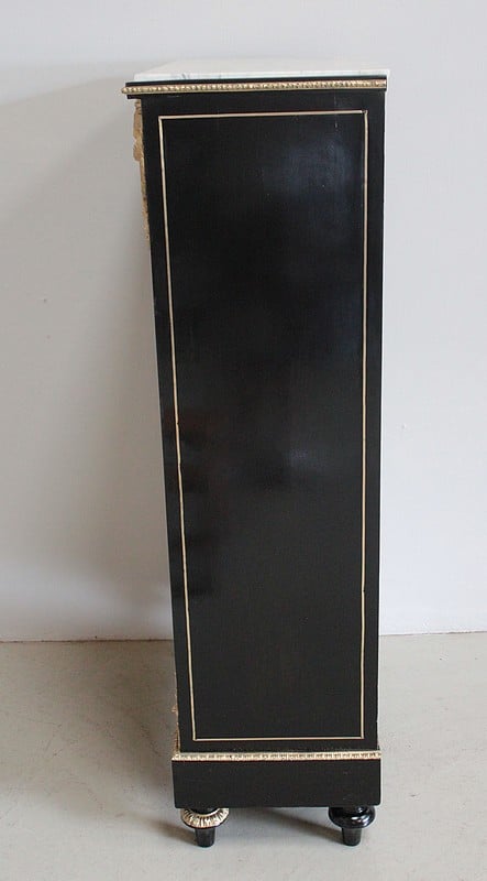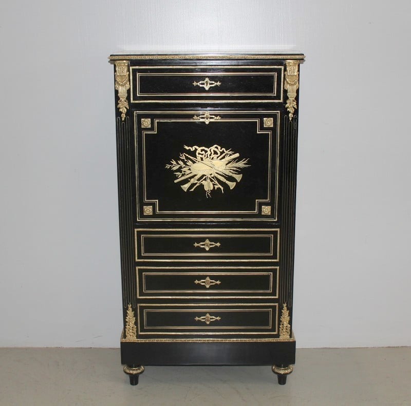 Secrétaire NAPOLÉON III en poirier noirci avec incrustations de laiton dans le goût Louis XVI, filets et motif central à décor d’instruments de musique, de feuilles et de nœud sur l’abattant.