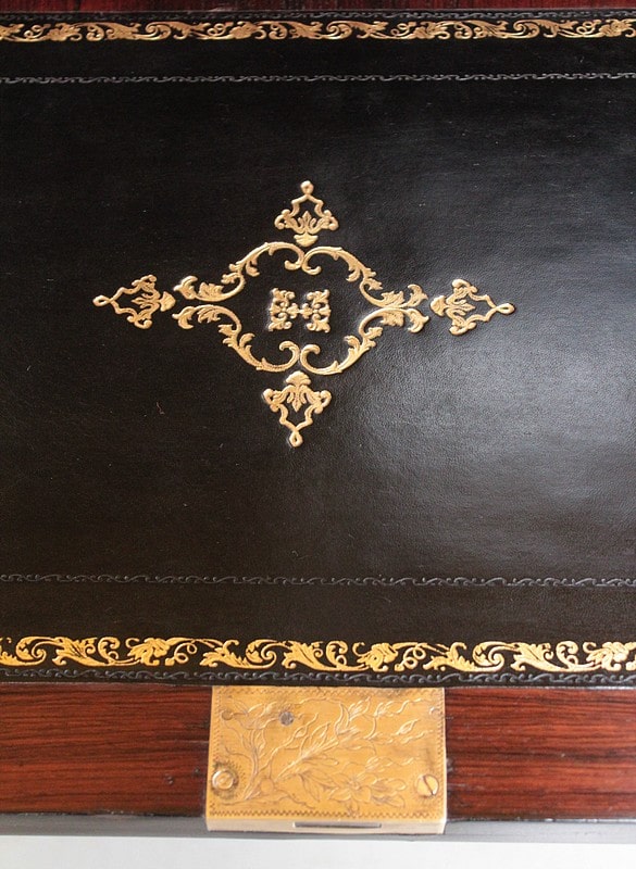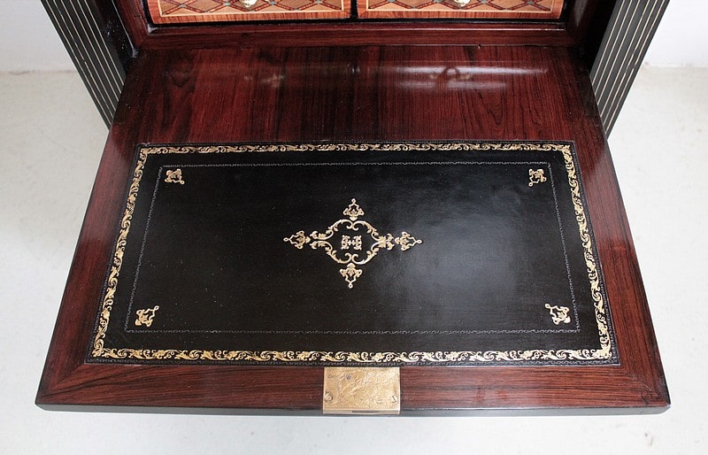 L’abattant découvre un intérieur en palissandre avec marqueterie de bois clairs et teintés sur la façade des 3 petits tiroirs. Il est recouvert d’un cuir noir avec vignette dorée (changé) et se trouve à 72cm du sol.