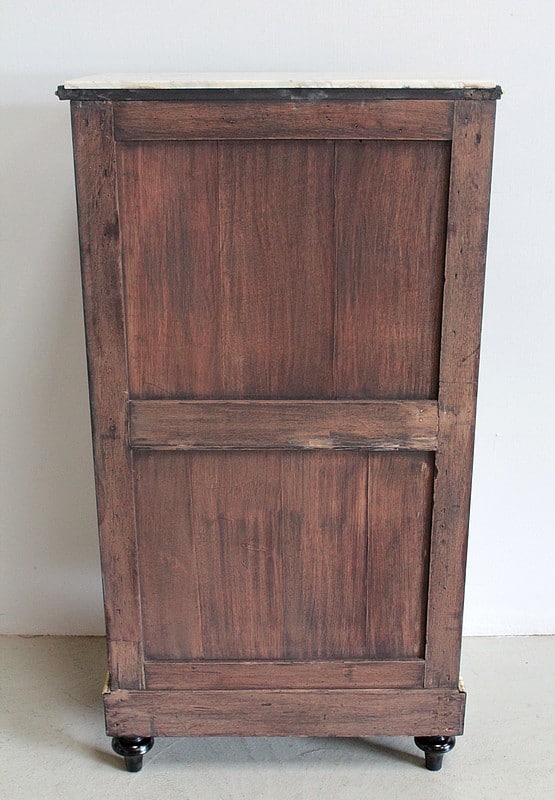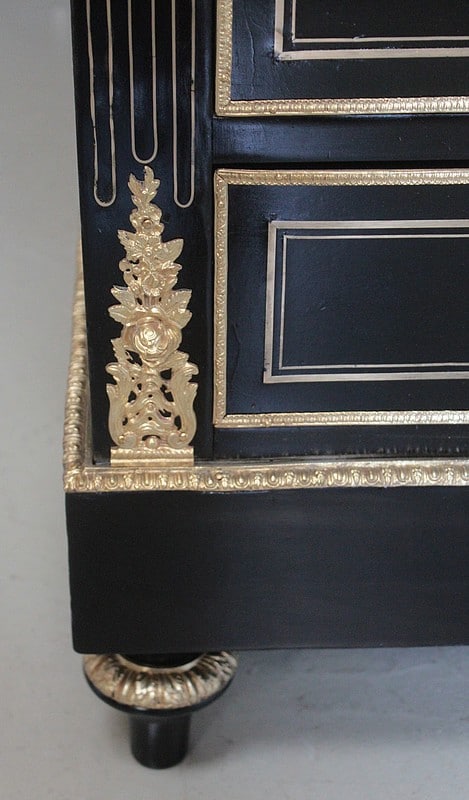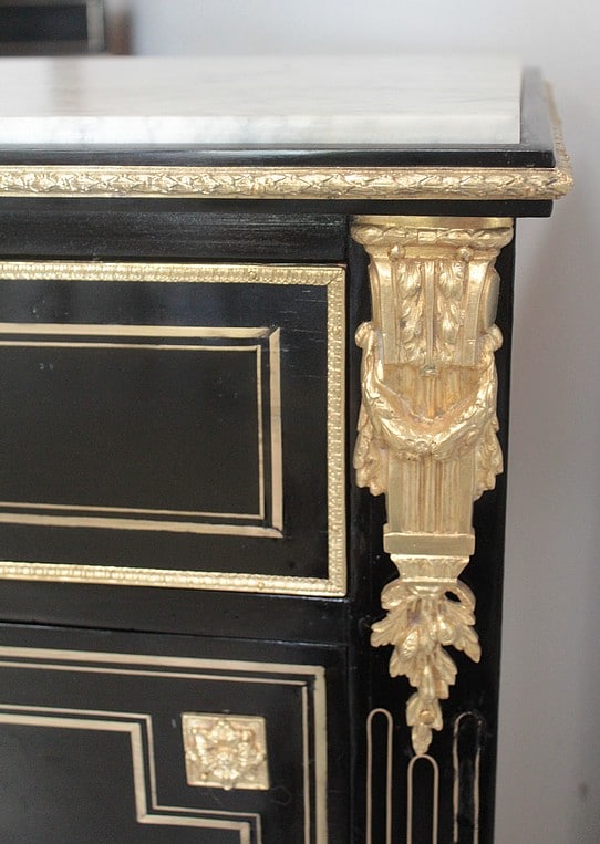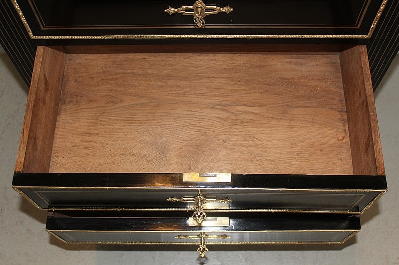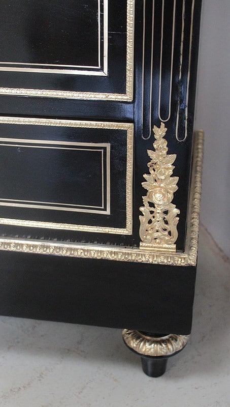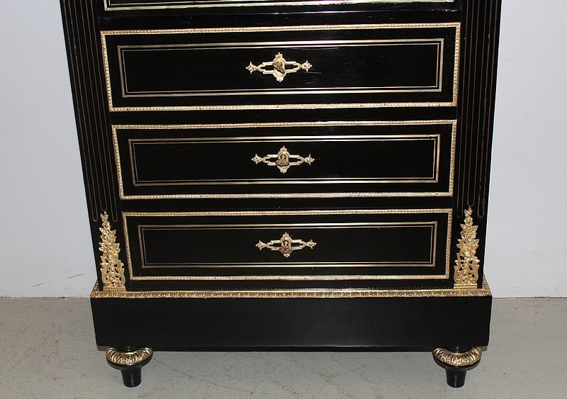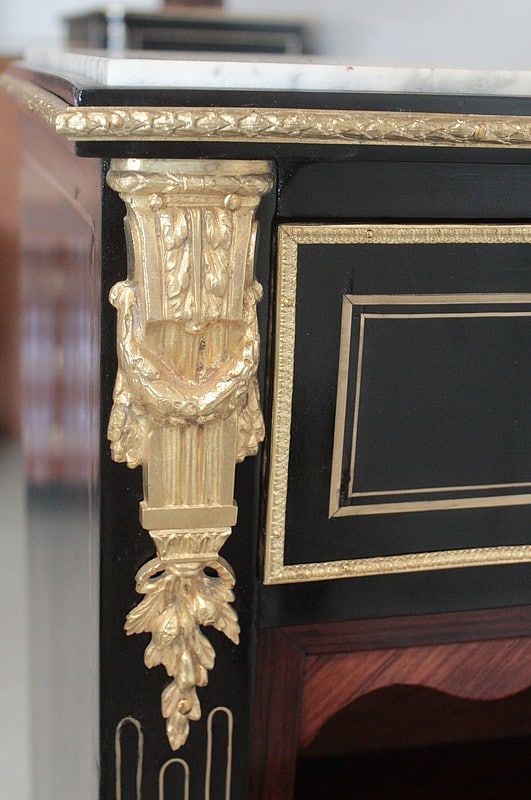 Nombreuses garnitures de bronze : chutes haut et bas, entrées de serrures, moulures ciselées et il repose sur 4 pieds ‘toupie’ ceux de l’avant ornés de bronze.