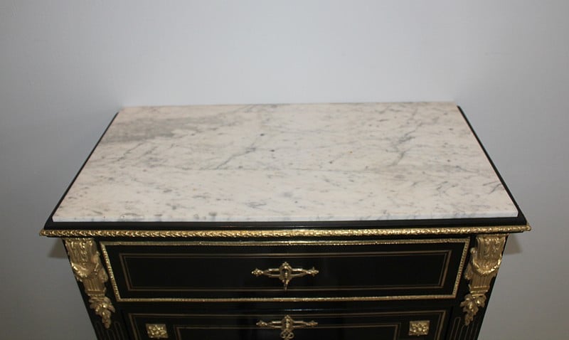 Parfait état après restauration, décapage et finition au verni tampon dans notre atelier. Dépose de tous les bronzes, nettoyage et repose.