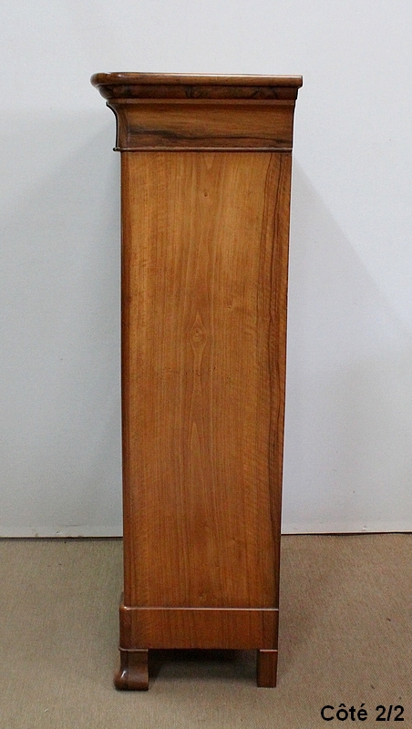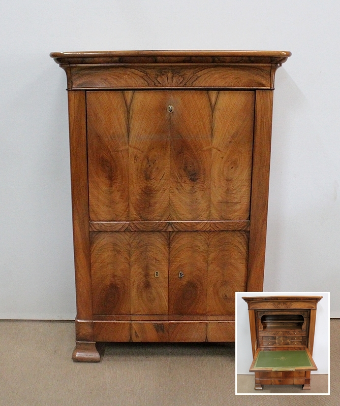 Secrétaire d’époque Restauration en placage de Ronce de Noyer et Noyer Massif doté en partie haute d’un tiroir en ceinture s’ouvrant par deux encoches en dessous.