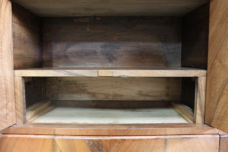 En partie basse de ce secrétaire, deux portes dont la fermeture se fait à noix avec serrure sur crochet d’origine, révèlent une étagère et un grand tiroir se fermant à clé. La plinthe quant à elle dissimule un autre tiroir muni de quatre feuilles de ronce de noyer également.