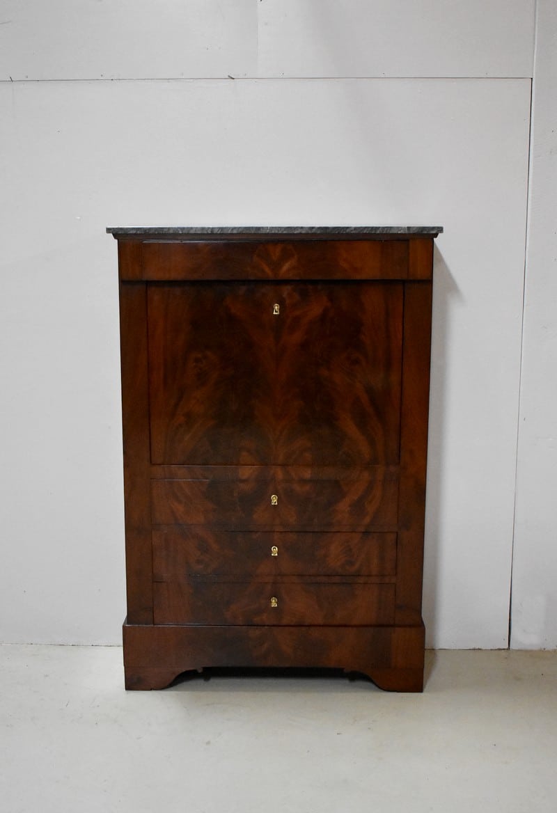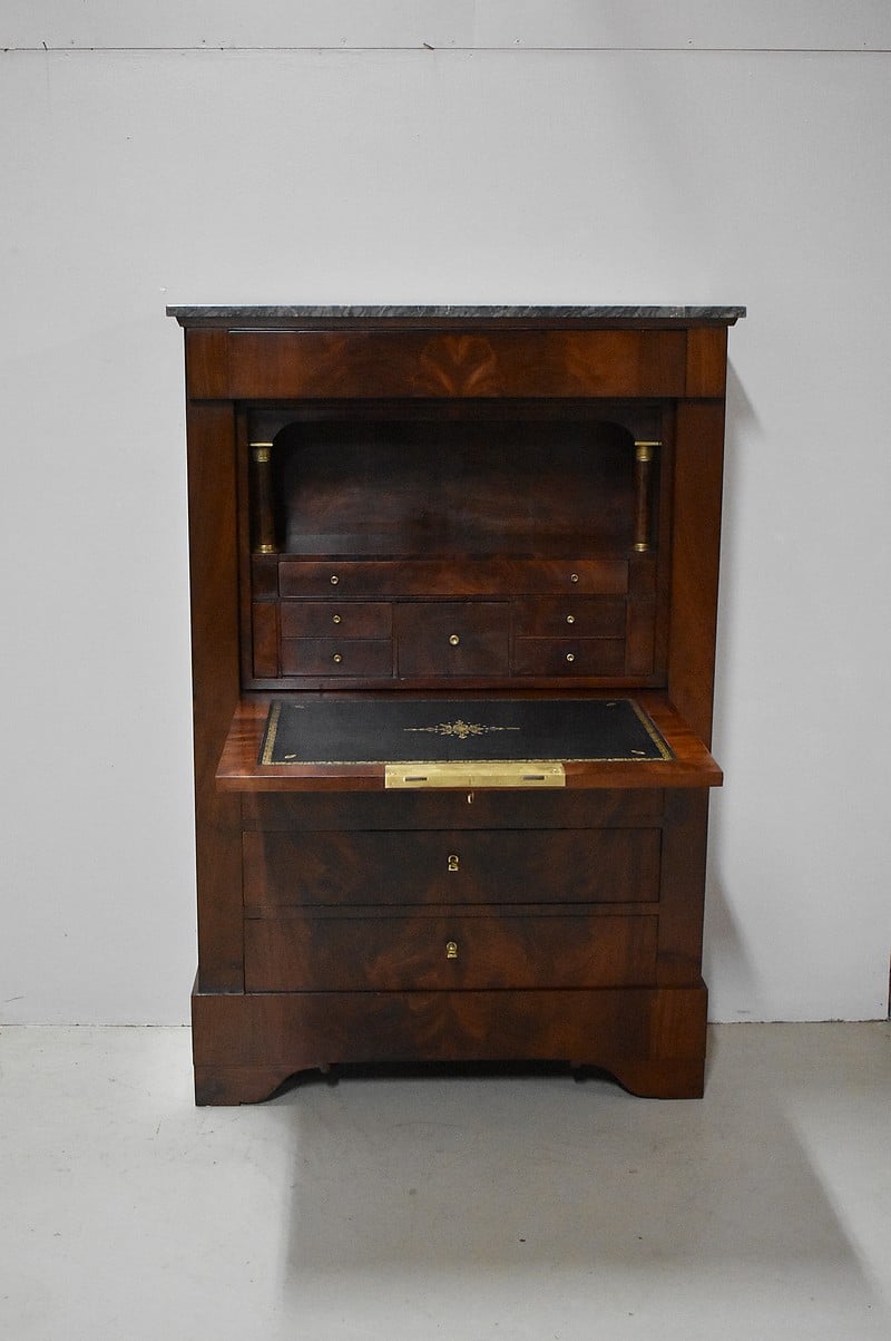 Secrétaire Restauration en placage de ronce d’Acajou avec son dessus en marbre gris Cipolin.