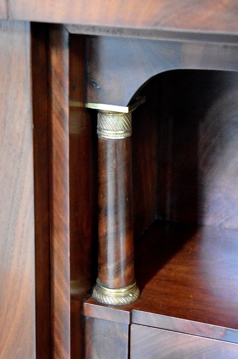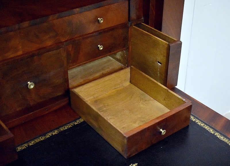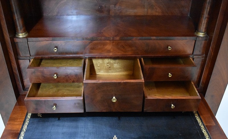 Il ouvre par un tiroir sans serrure en ceinture haute et par un abattant au milieu, donnant sur un tabernacle à 6 tiroirs en plus de deux tiroirs secrets de chaque côté. L’intérieur de l’abattant est recouvert d’un cuir noir changé orné d’une frise dorée sur son pourtour, de deux frises gravées à l’extérieur et l’intérieur ainsi que de petits motifs dans chaque angle et d’un grand motif central. En partie haute, la niche est encadrée de deux colonnes détachées, baguées haut et bas de laiton finement ciselé.