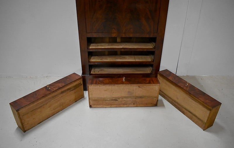 Le secrétaire ouvre également par 3 tiroirs en partie basse dont le fond et les côtés sont en chêne, tous fermant avec leur clef respective et l’arrière est panneauté.