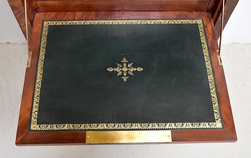En dessous, ce Secrétaire offre un abattant à quatre feuilles de Placage symétriques. Il découvre un Tabernacle composé d’une Niche, enjolivée par un panneau découpé en Arche et Colonnes factices. Ce Théâtre propose également sept tiroirs aux capacités diverses, dont le dernier est à ouverture Secrète. L’espace de travail, Solidement maintenu à l’horizontal par une Paire de Compas Droits, est recouvert d’un Cuir de couleur Verte, à Vignette Centrale et Frise Dorée.