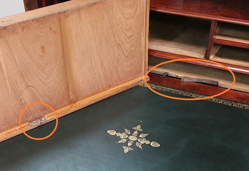 Ce Secrétaire est fourni avec ses deux clés récentes, ajustées aux Généreuses entrées de serrures d’Origine, toutes en Laiton finement ouvragé. On remarquera la Fiabilité des Verrous, à points d’accroches doubles pour l’abattant, haut et bas pour la porte de droite.