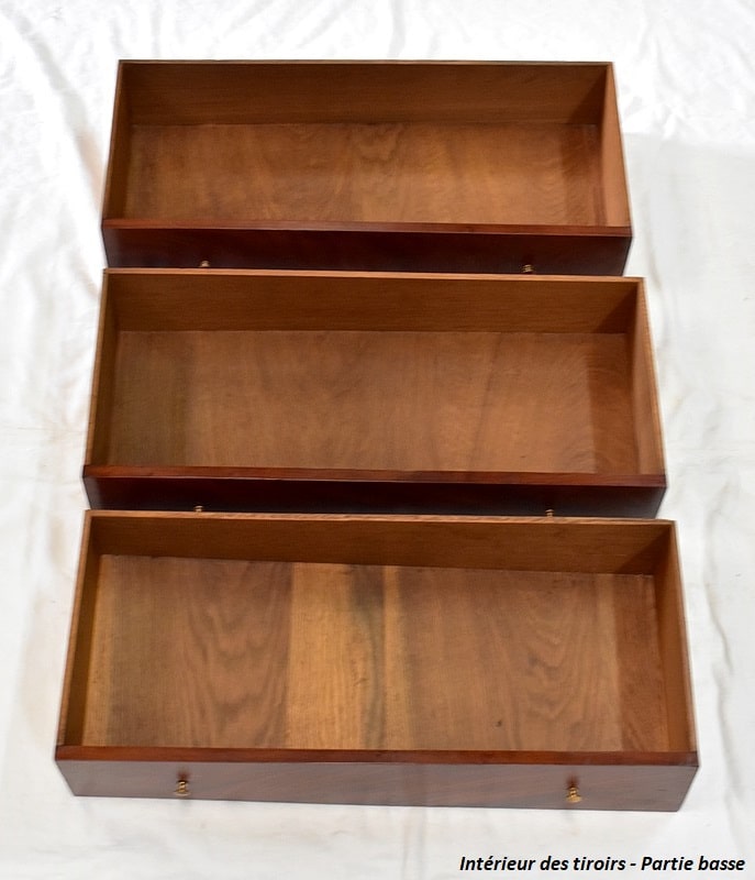 En partie basse, ce Meuble ouvre par deux portes. Elles abritent trois autres tiroirs, disposés sur trois rangs et assemblés en Queues d’Arondes.