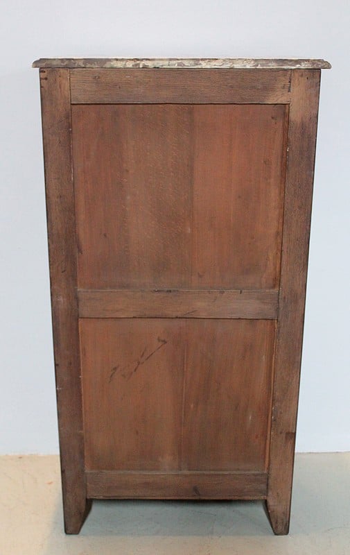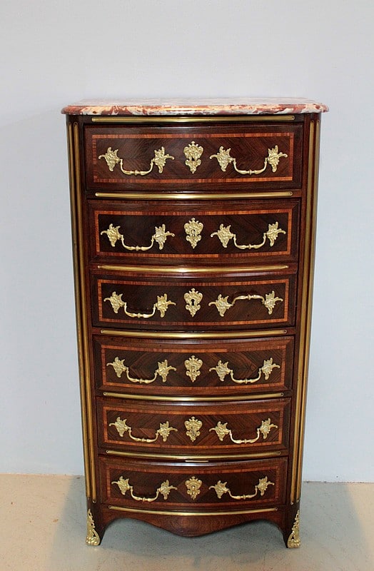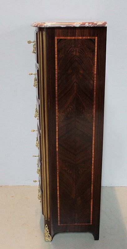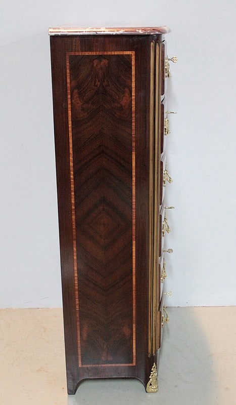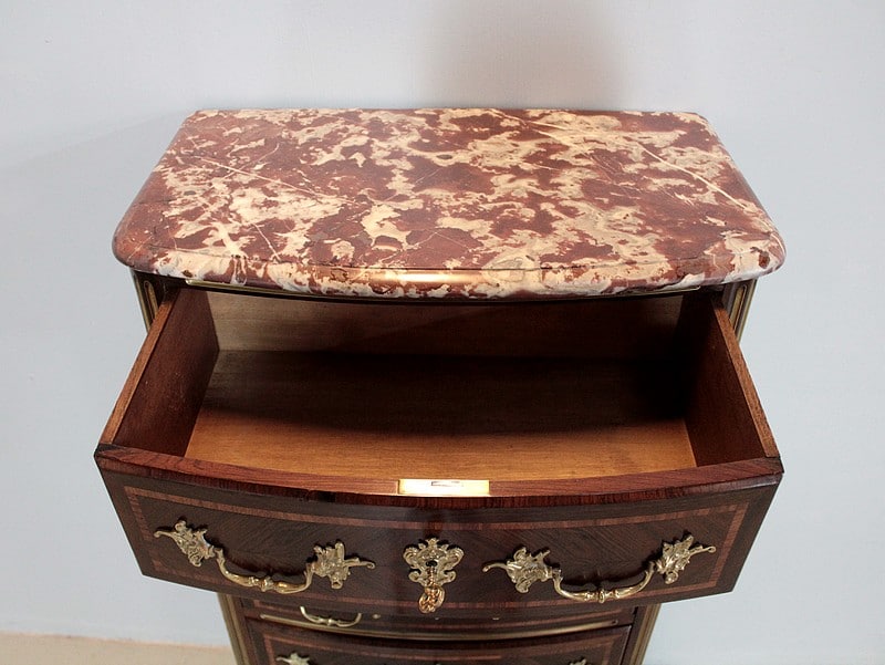 Secrétaire formant Semainier de style Régence en placage de bois de violette avec filets de bois de rose. Dessus en marbre rouge des Pyrénées.