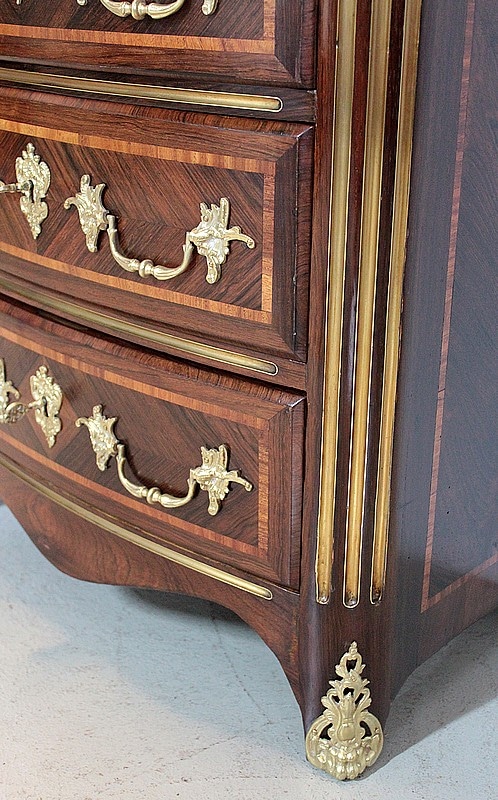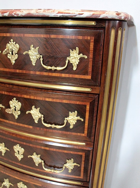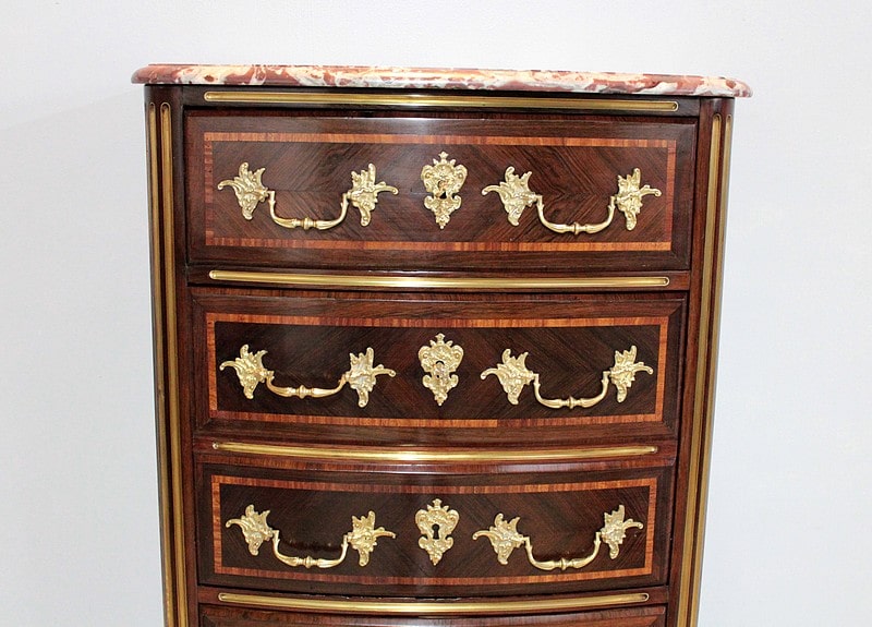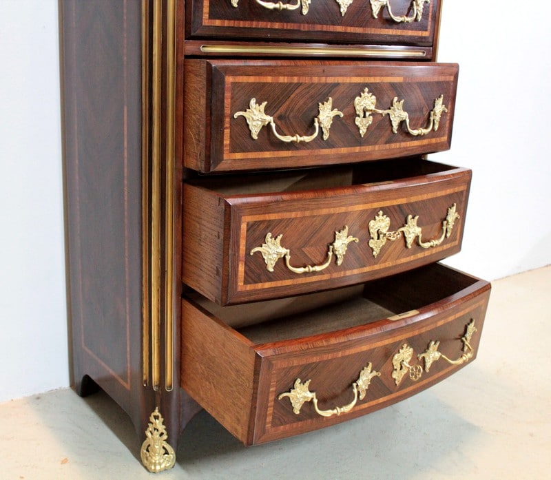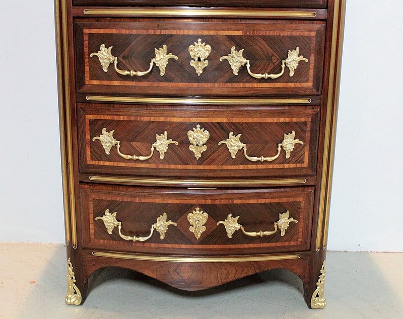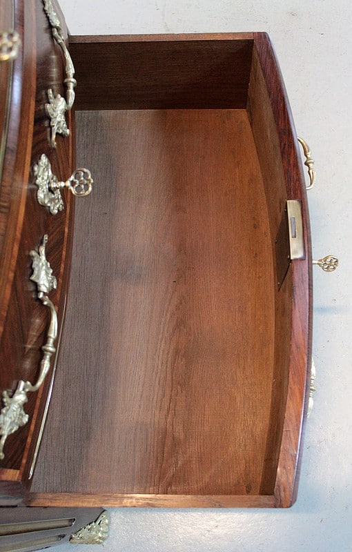 Les tiroirs sont ornés de poignées de tirage et d’entrées de serrures en bronze.