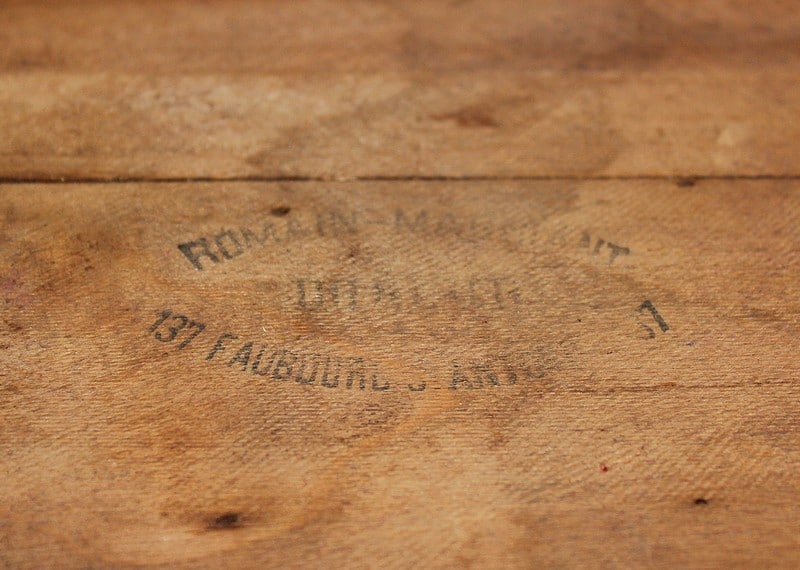 Pochoir du fabricant sur le bois de l’abattant ‘Romain…..137 Faubourg t-Antoine…’