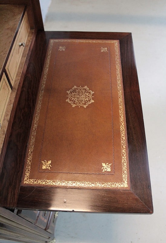 L’abattant découvre un intérieur en érable moucheté composé d’un casier avec étagère et de 2 tiroirs dont la façade est incrustée d’un filet de bois teinté vert. Il est recouvert d’un cuir de couleur fauve qui a été changé.