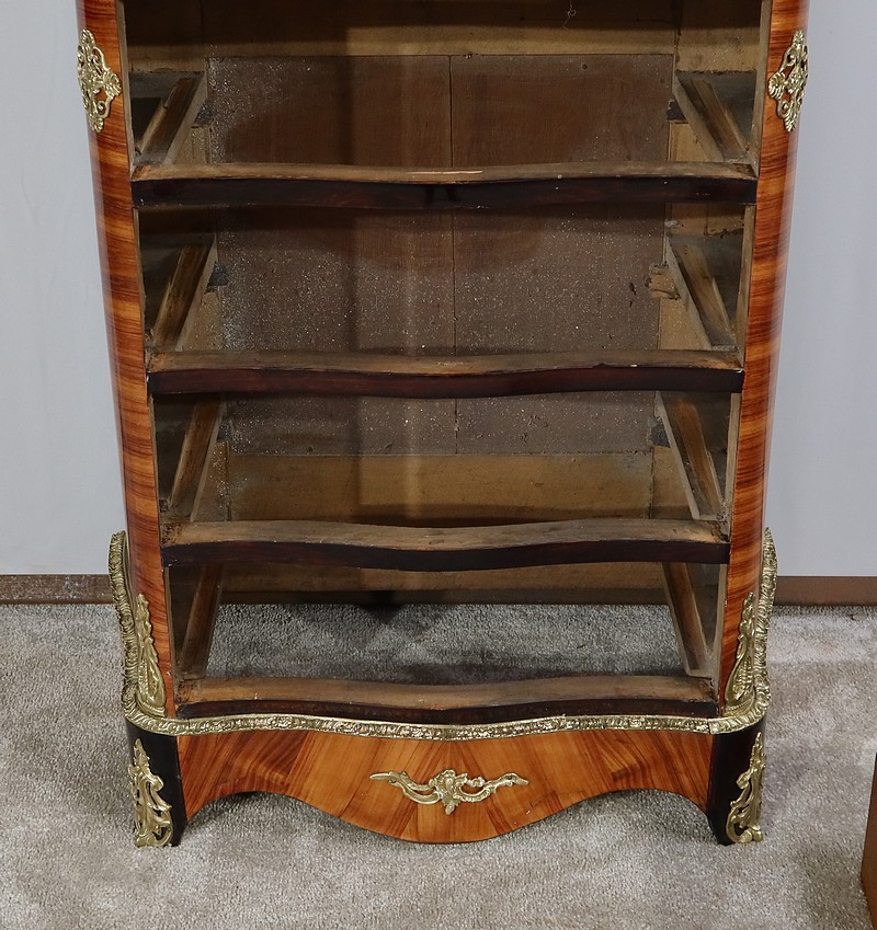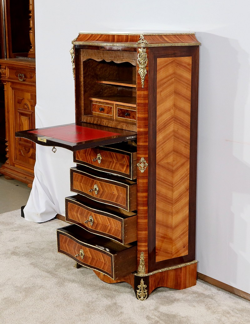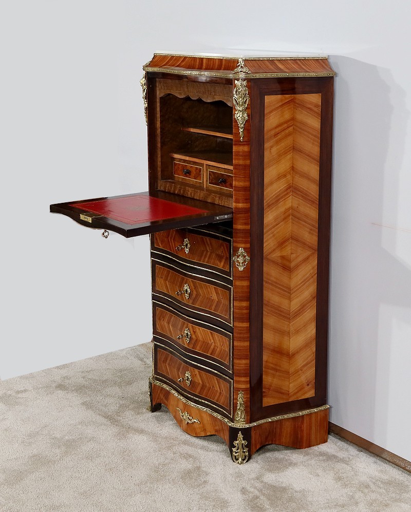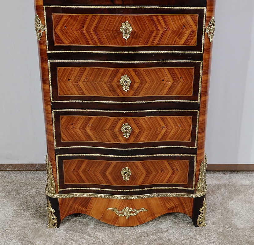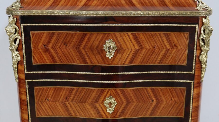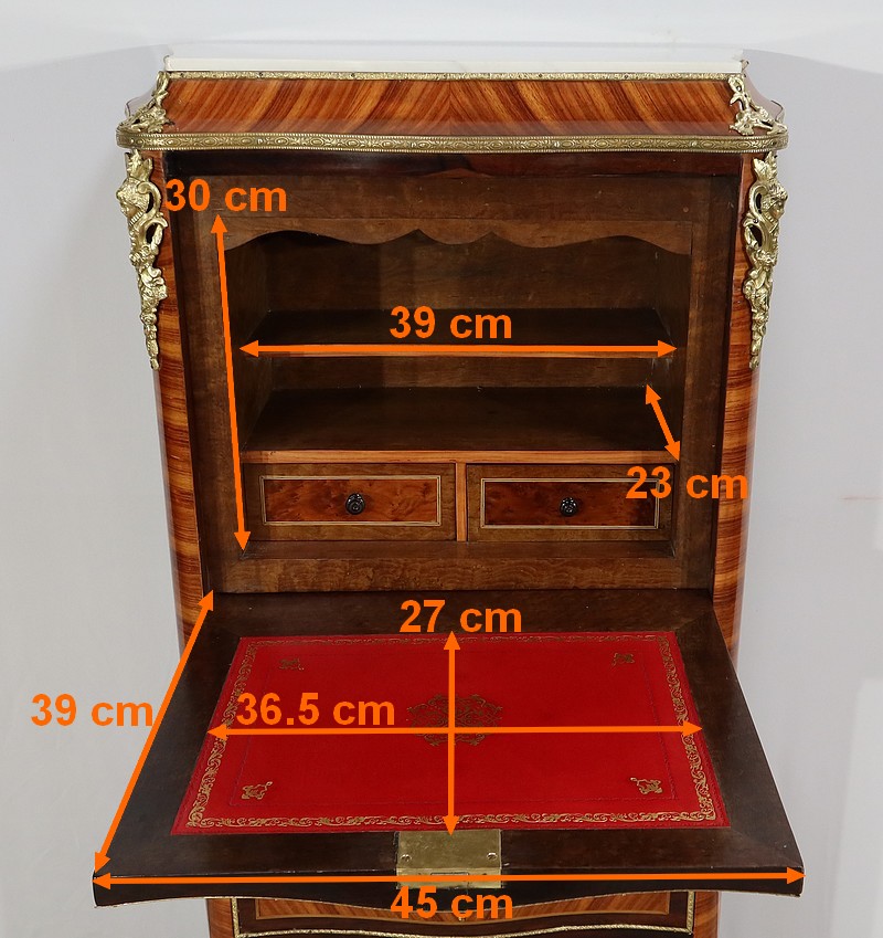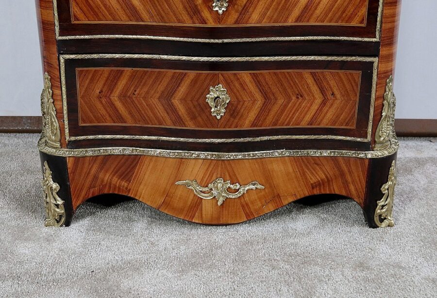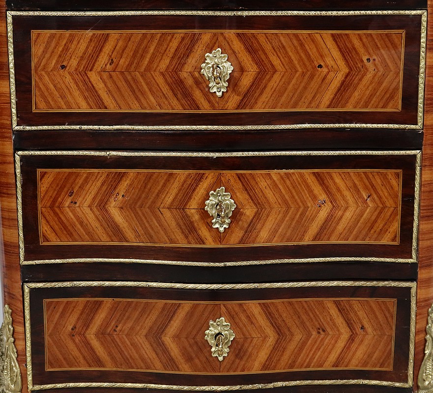 La façade et les côtés de ce secrétaire bénéficie de nombreuses garnitures en bronze. Les pieds arrondis en placage de bois de rose mettent en valeur les chutes hautes et basses. Les côtés sont légèrement galbés vers l’arrière et nous retrouvons au centre un important quatre feuilles en bois de rose avec entourage en palissandre.