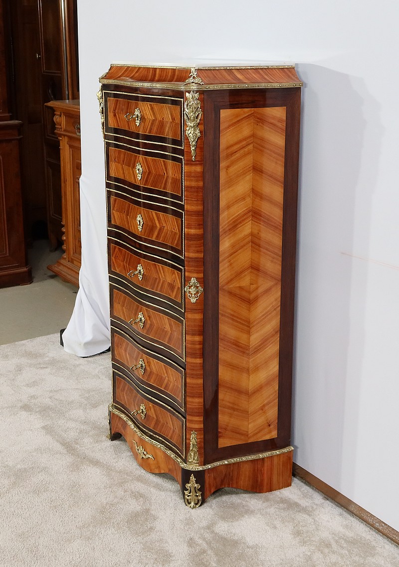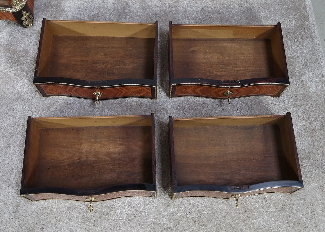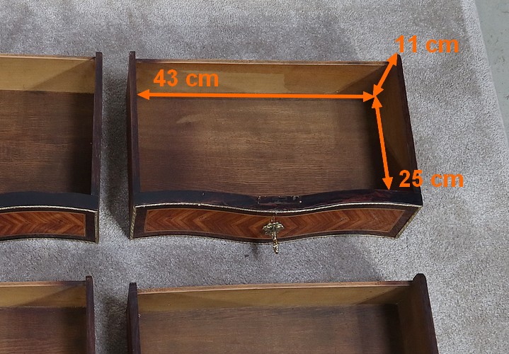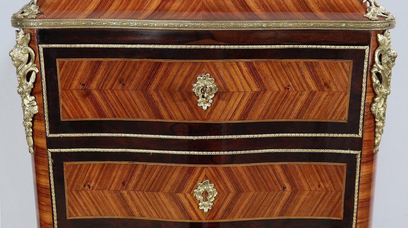Les tiroirs sont légèrement galbés sur le devant et soulignés par des baguettes en bronze sculpté. En façade, ils sont composés de bois de rose au centre disposé en quatre feuilles, avec dans le pourtour un filet de bois clair et un large entourage en palissandre. Chaque tiroir est muni d’entrées en bronze et de serrures d’origine accompagnées de leur clé, en état de fonctionnement.