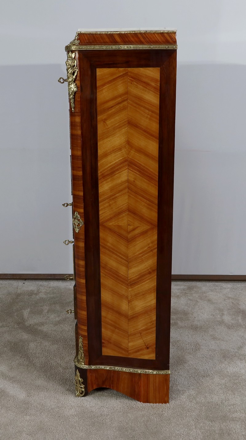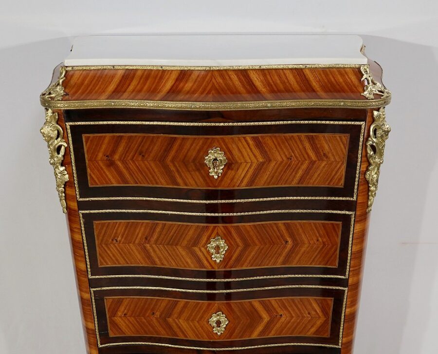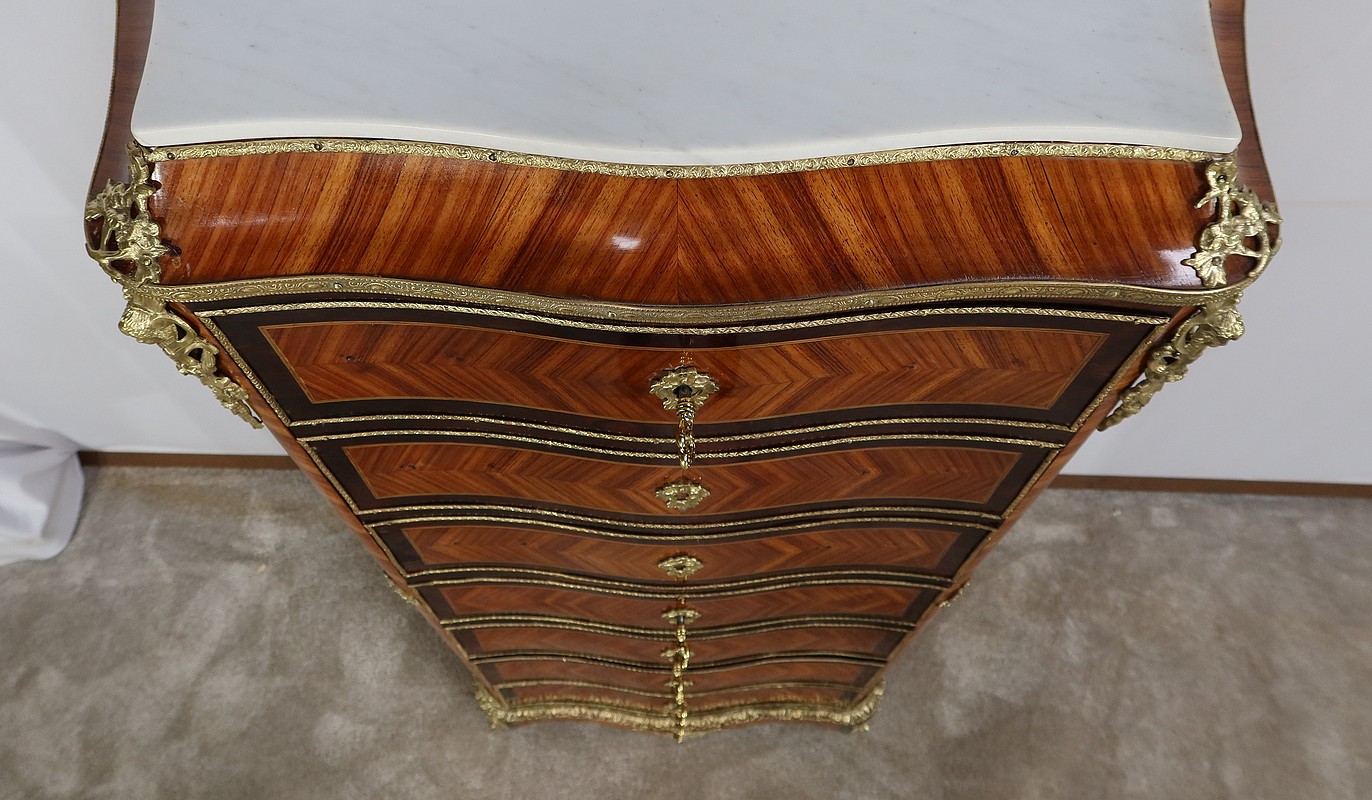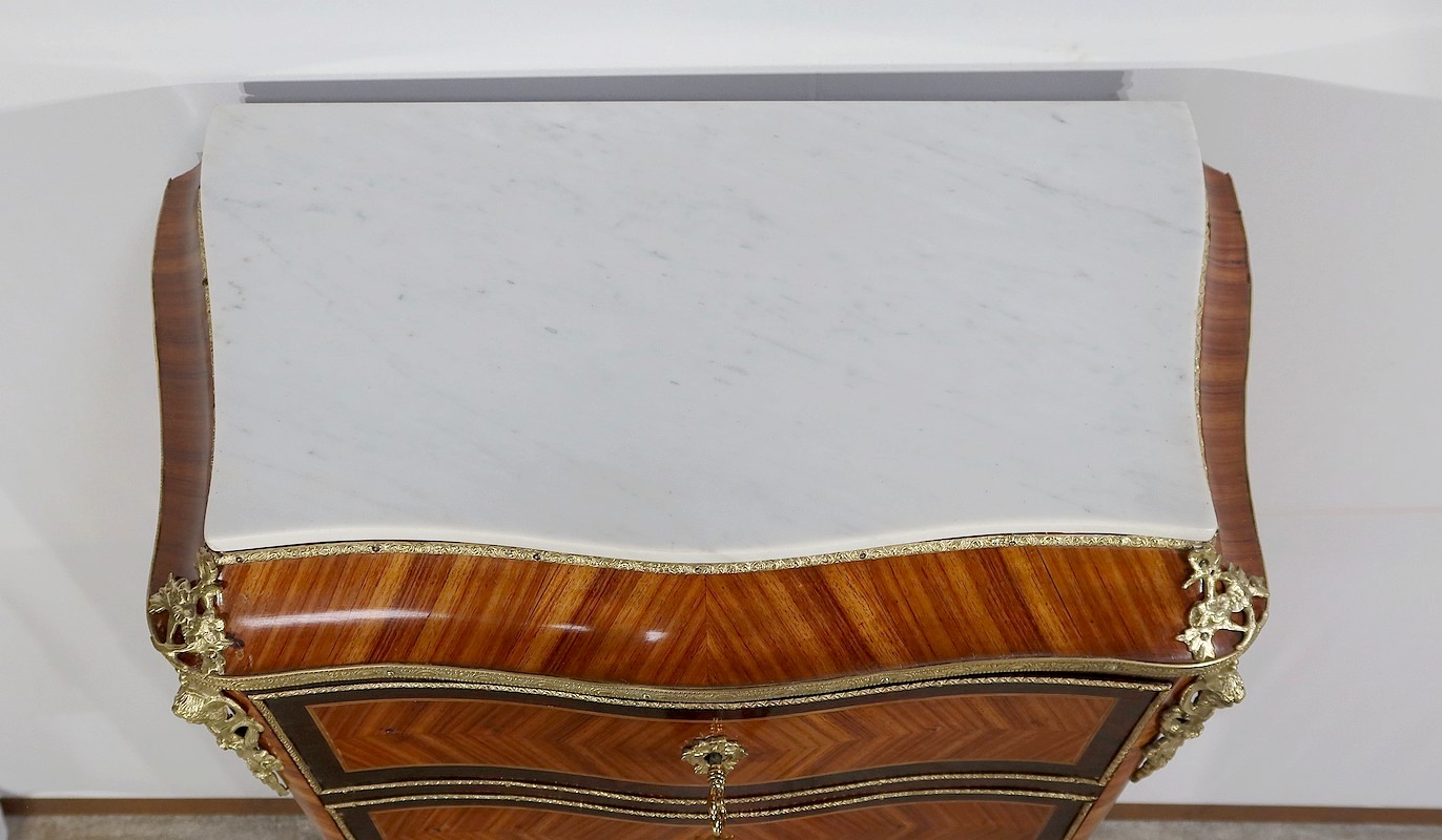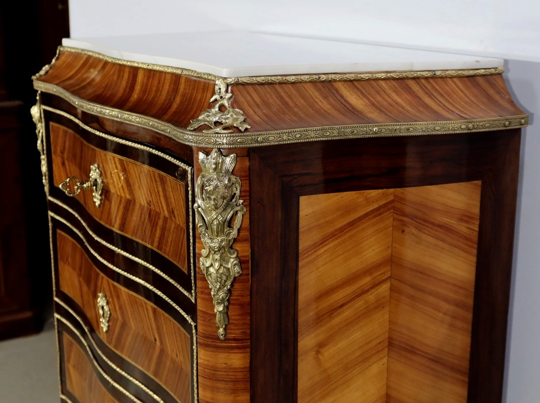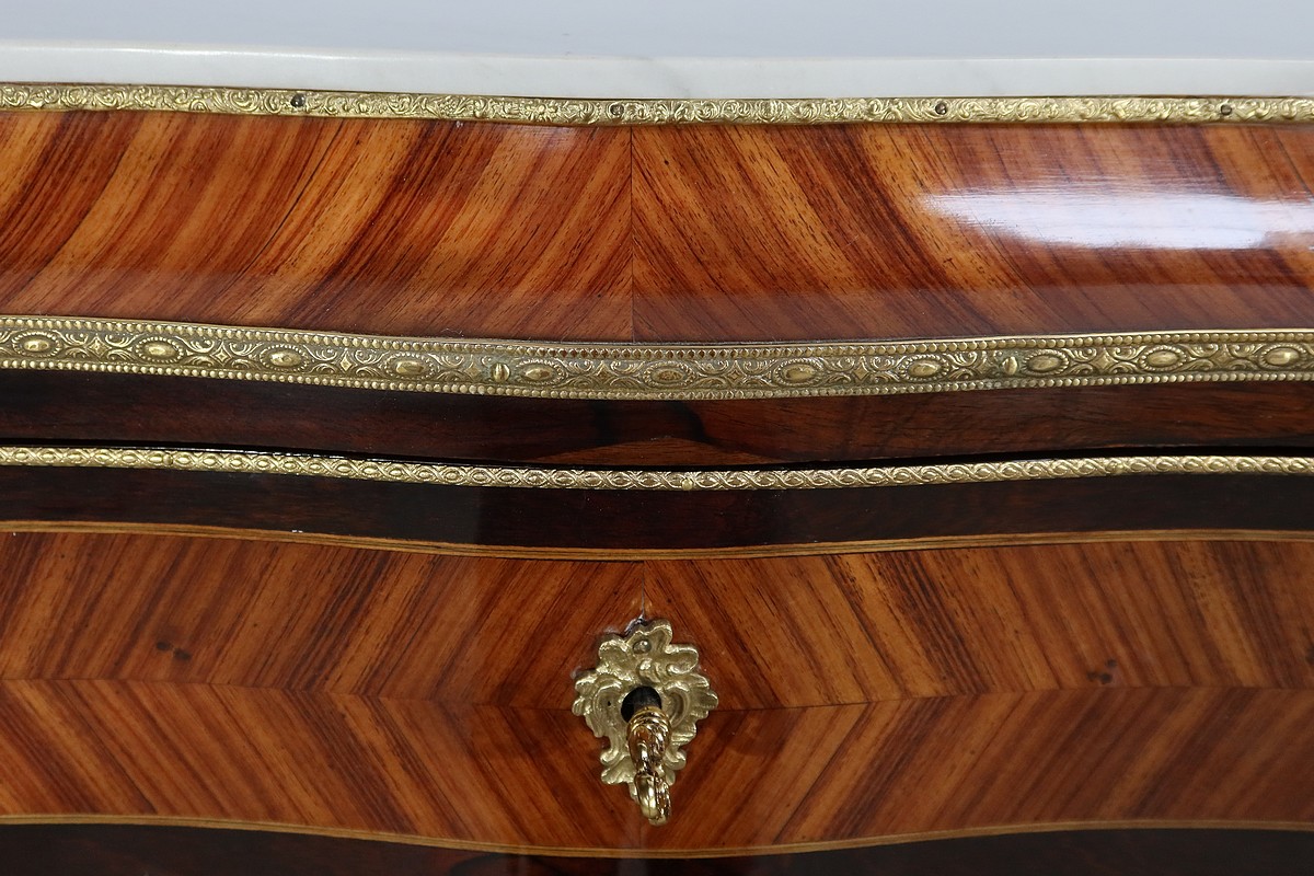 Magnifique meuble d’époque Napoléon III, issu d’un atelier d’ébénisterie Parisien du XIXe siècle, surmonté d’un marbre blanc de carrare épousant le galbe de la façade et des côtés.