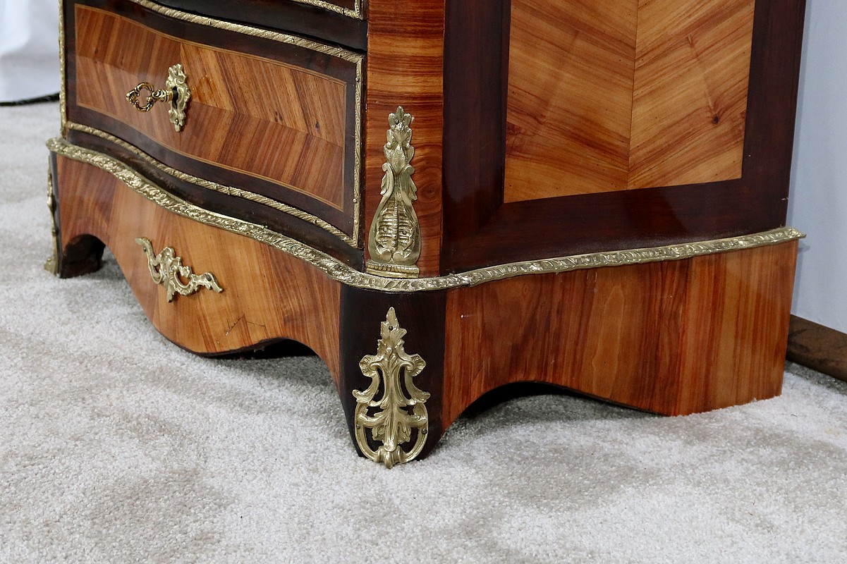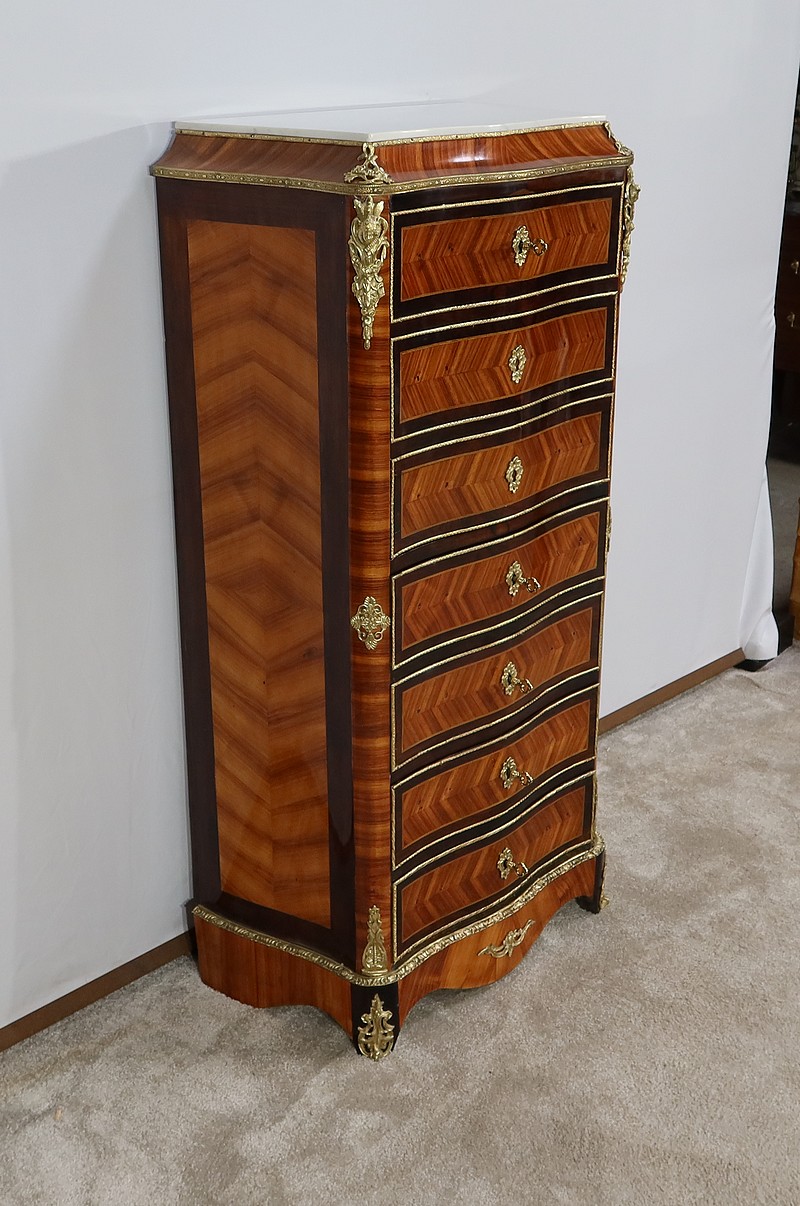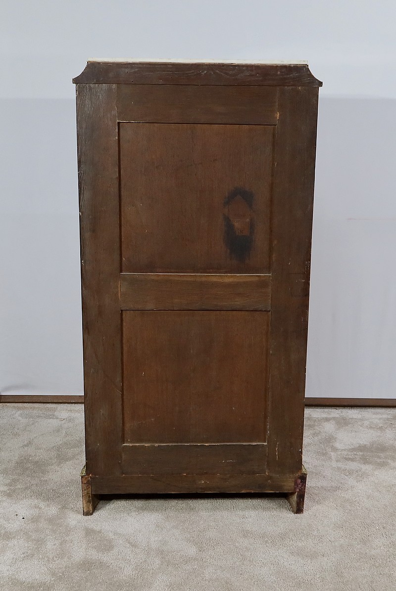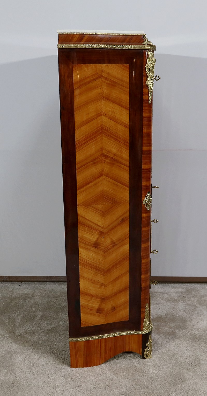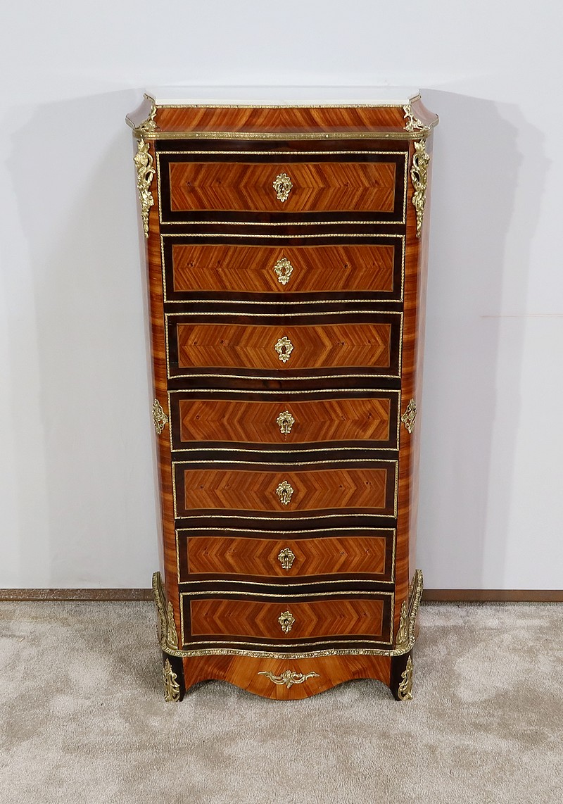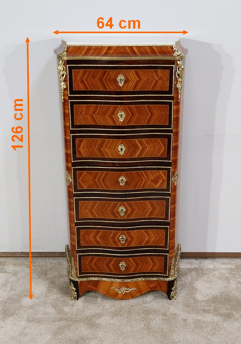 Magnifique meuble d’époque Napoléon III, issu d’un atelier d’ébénisterie Parisien du XIXe siècle, surmonté d’un marbre blanc de carrare épousant le galbe de la façade et des côtés.