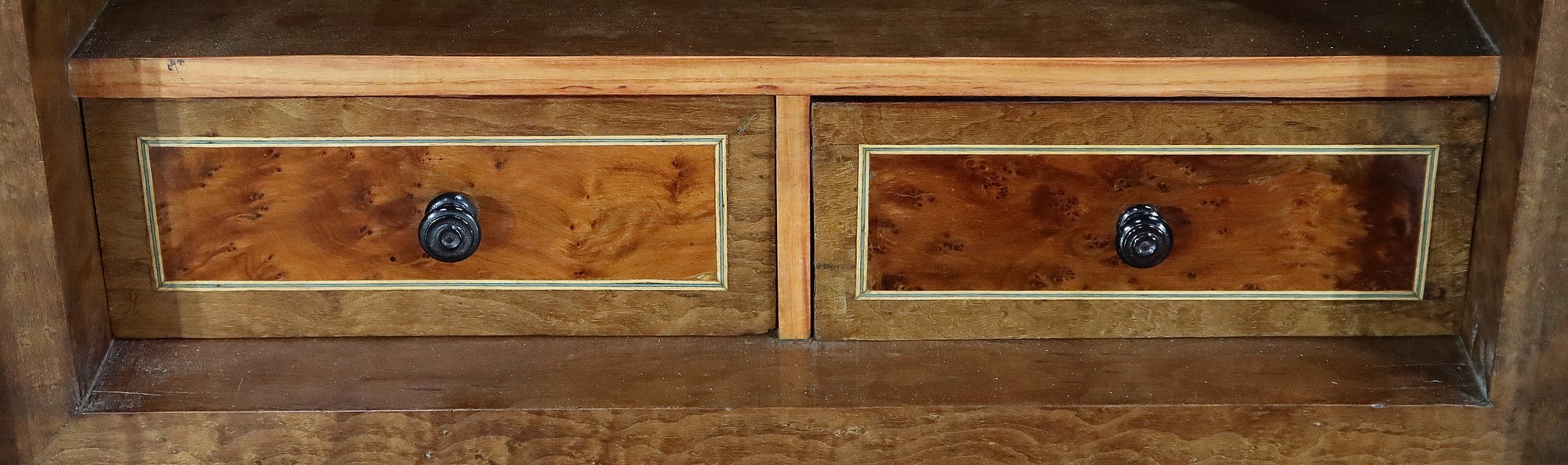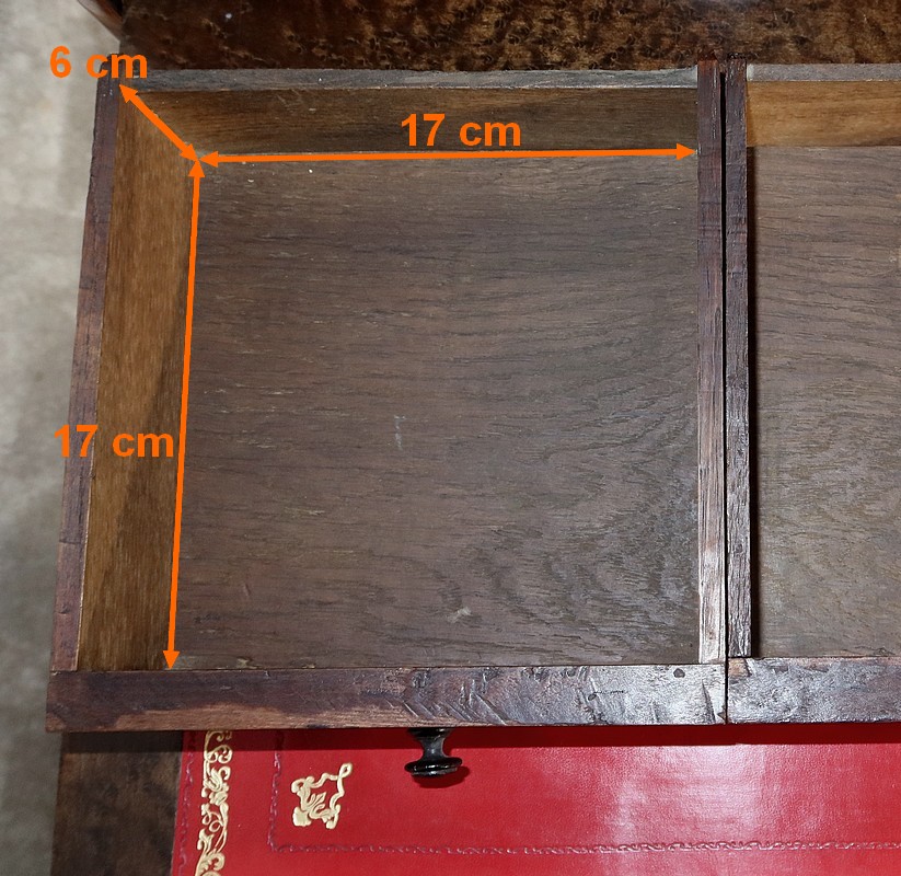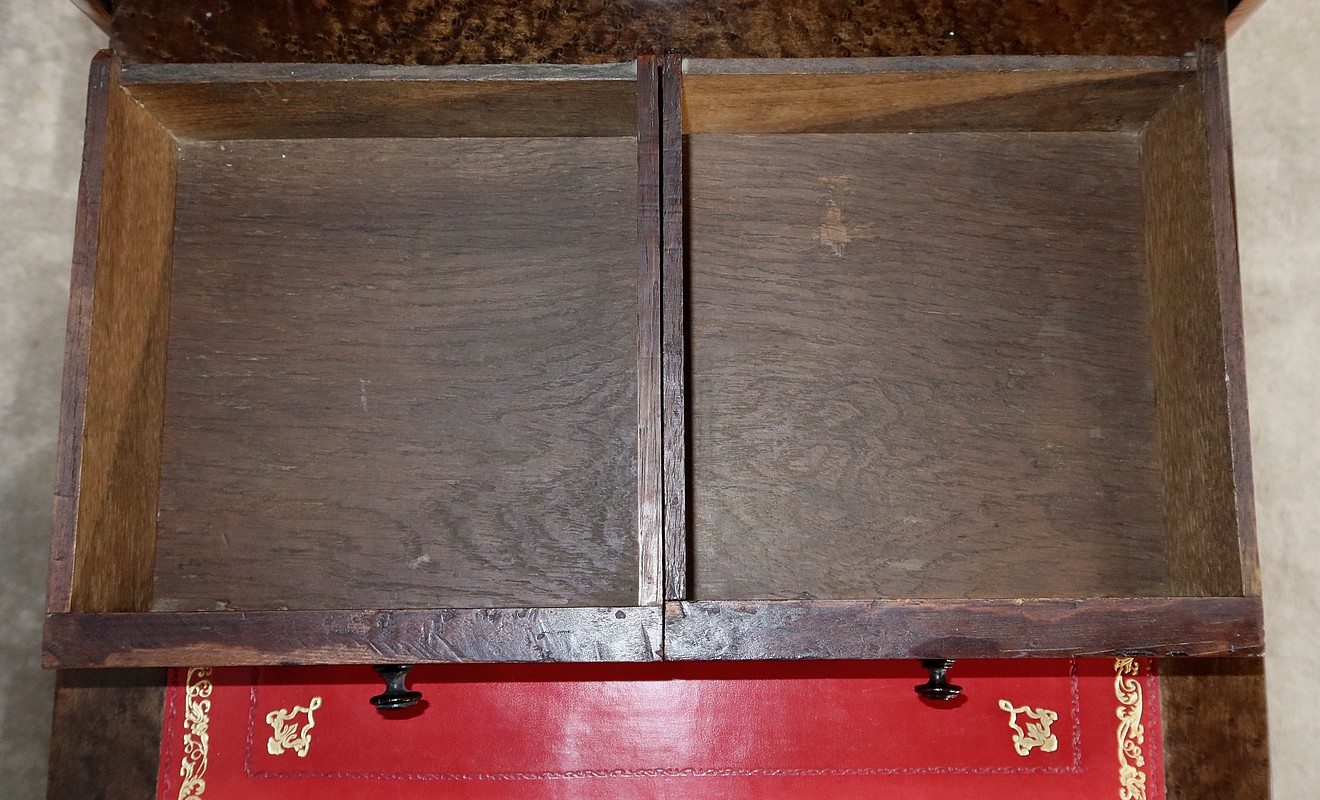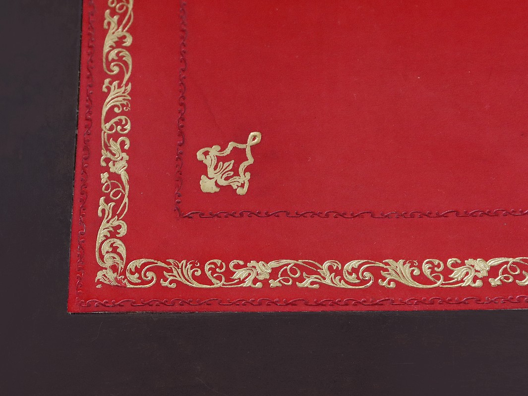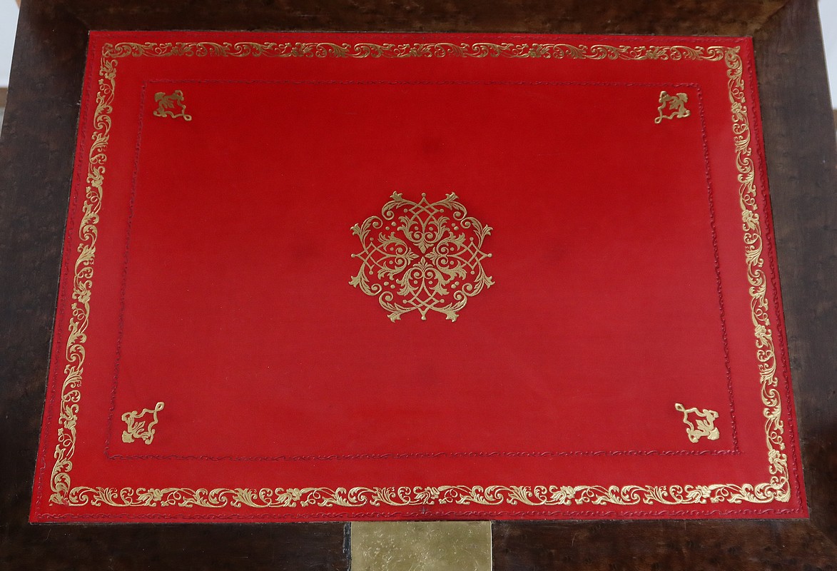 L’ouverture de l’abattant révèle un tabernacle en moucheté d’érable, composé de deux niches et de deux petits tiroirs avec façade en thuya et boutons en palissandre. L’abattant en moucheté d’érable teinté est foncé d’un cuir rouge en parfait état enrichi d’une vignette dorée, de motifs aux angles et d’un ornement central harmonieux.