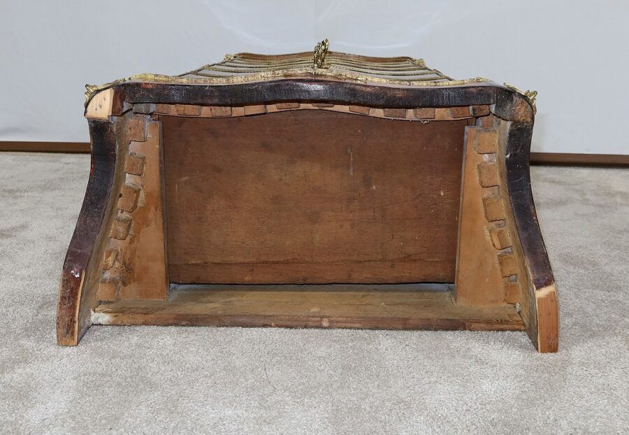 Dans son dessus en saillie se trouve une importante moulure en bronze godronné. A chaque angle, nous retrouvons une chute en bronze et au milieu un motif entrelacé.