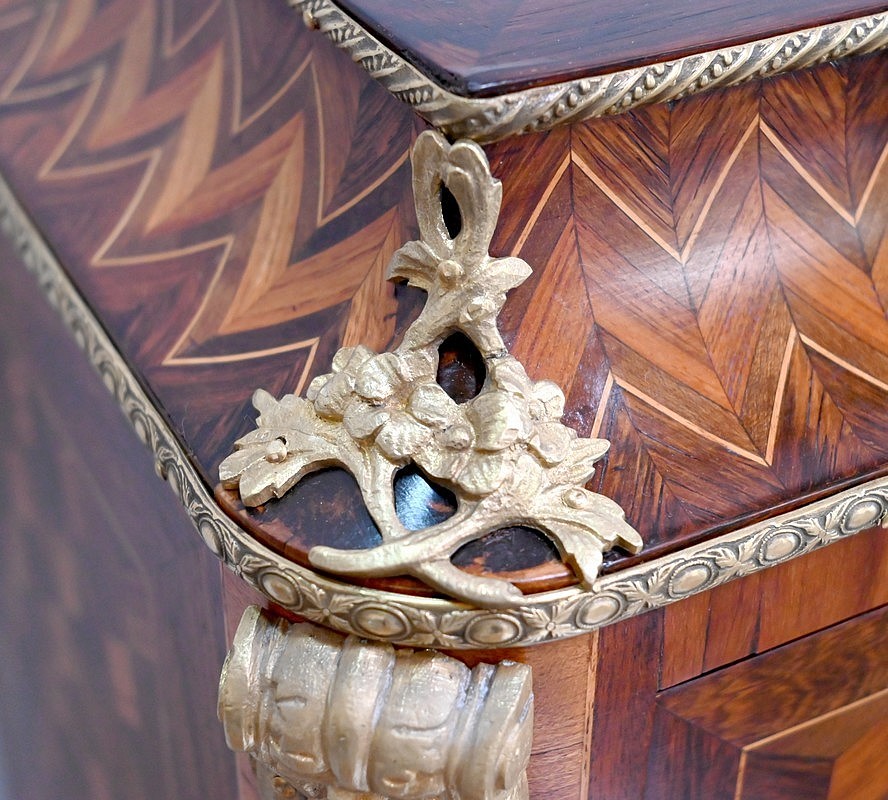 Le dessus de ce mobilier aux côtés concaves, en marqueterie de bois précieux disposée en chevrons, est agrémenté de deux baguettes laiton aux arêtes. Chaque angle est paré d’un motif en bronze représentant des fleurs.
